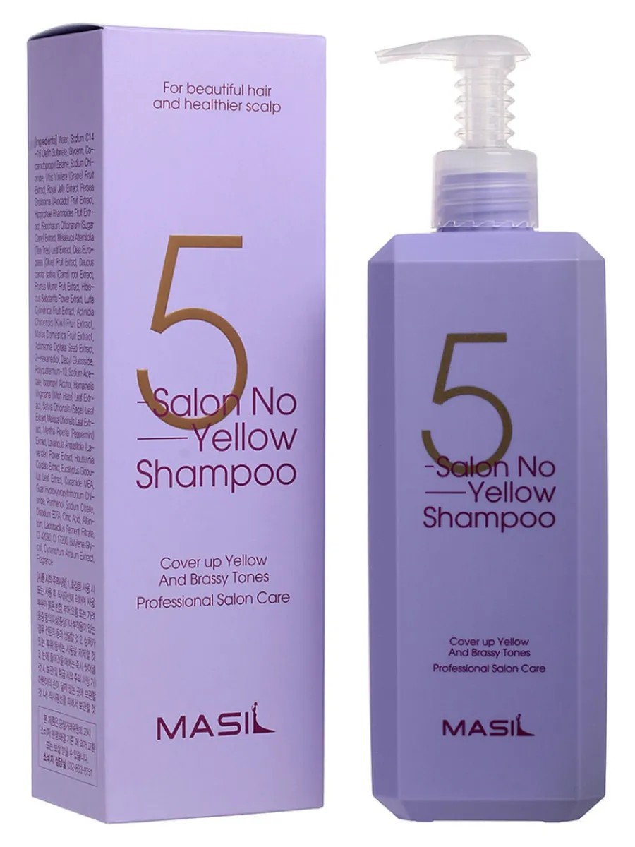 Masil 5 Salon No Yellow Shampoo, a toning shampoo for bleached hair, prevents yellowing and pigment fading, preserving and maintaining the color of color-treated hair. This shampoo makes hair smoother and more manageable, eliminates breakage and frizz, and restores healthy shine. It gently removes impurities and strengthens weakened roots. Directions: Apply shampoo to damp, clean hair and scalp, massage gently for 3-5 minutes, and rinse thoroughly with warm water.