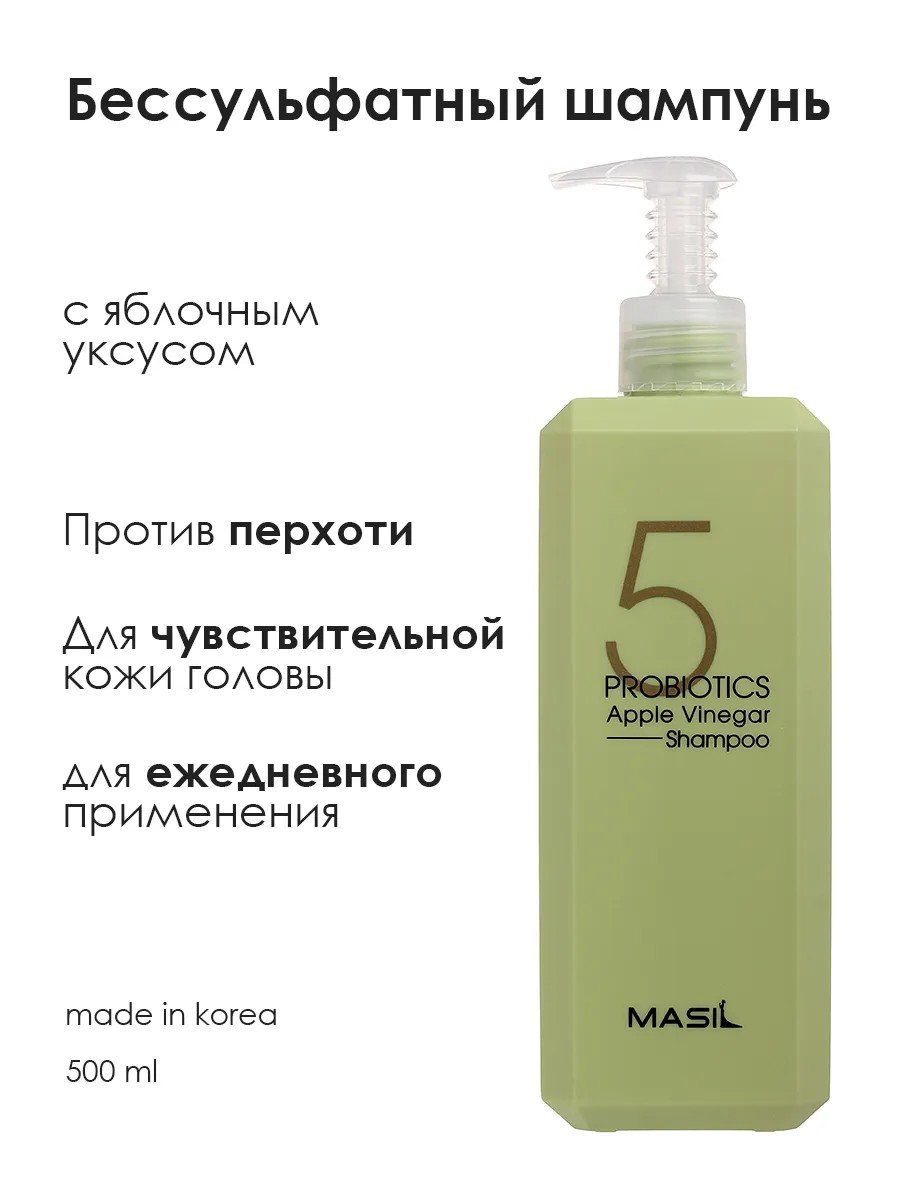 5Probiotics Apple Vinegar Shampoo. A gentle, sulfate-free shampoo with apple cider vinegar, MASIL 5PROBIOTICS APPLE VINEGAR SHAMPOO is recommended for sensitive scalps that experience dryness, dandruff, itching, and loss of shine when cleansed too vigorously. Enriched with apple cider vinegar, its acidic formula seals keratin cuticles and smoothes hair, adds shine, and conditions the scalp. This shampoo is formulated with mild surfactants. Directions: Apply to damp, clean hair and scalp, gently massage for 2-3 minutes, and rinse thoroughly with warm water.