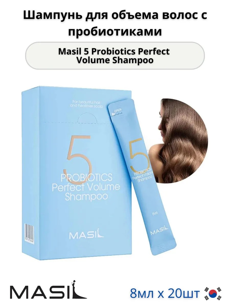 MASIL 5 Probiotics Perfect Volume Shampoo— это набор из 20 саше по 8 мл корейского шампуня, разработанного для придания волосам объема и восстановления их здоровья.