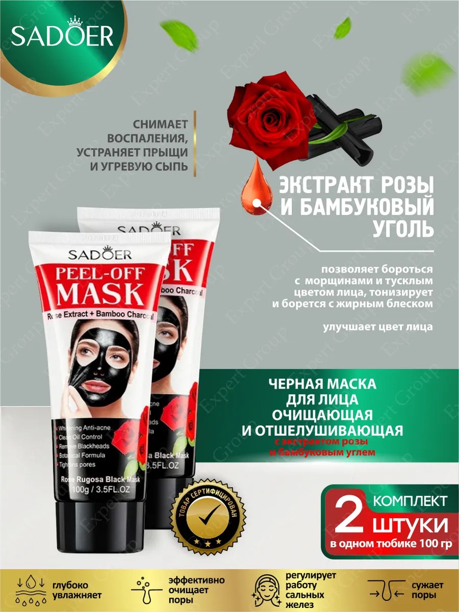 Очищающая и отшелушивающая черная маска Sadoer с розой и бамбуковым углем 100 гр. х 2 шт. Маска для лица содержит бамбуковый черный уголь, который способствует глубокому очищению кожи от прыщей и акне. Очищающая маска образует на коже легкую черную пленку, которая эффективно очищает поры, предотвращает появление прыщей и акне. Благодаря специальной формуле средство от черных точек способствует сужению пор, помогает бороться с несовершенствами кожи лица. Уход за лицом основная задача средство от прыщей. Уникальная формула в составе которой бамбуковый уголь адсорбирует и выводит загрязнения, токсины, излишки кожного жира. Экстракт розы славится своими антивозрастными и успокаивающими свойствами. Он помогает уменьшить покраснения и раздражения, а также придаёт коже свежесть и сияние. Косметическое средство для глубокой чистки лица подойдет для всех типов кожи. Органическая, профессиональная косметика поможет справиться с несовершенствами, сделает вашу кожу идеальной. Маска пленка подойдет для женщин и мужчин, а также подростков с проблемной кожей лица.