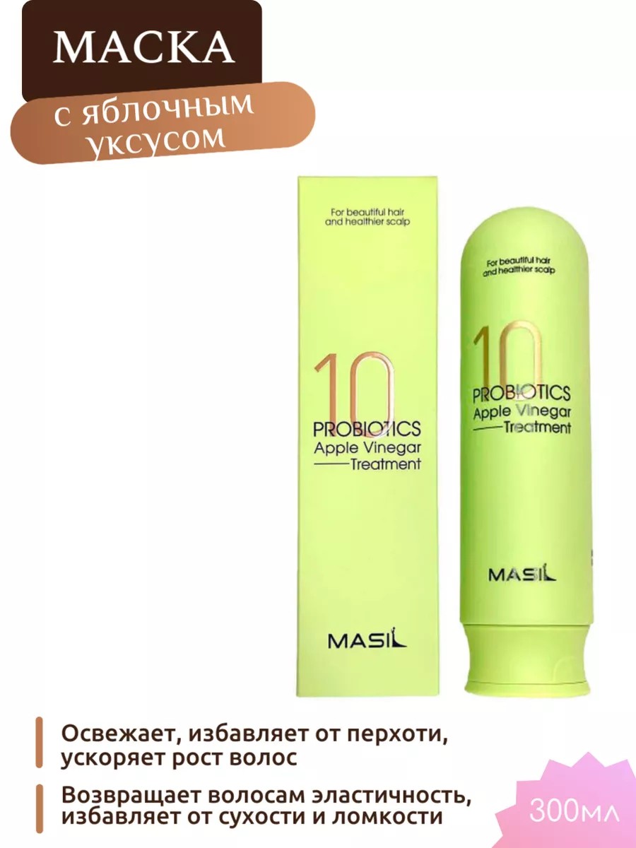 MASIL 10 PROBIOTICS APPLE VINEGAR TREATMENT Маска для волос против перхоти с яблочным уксусом и пробиотиками 300мл. Представляем вам уникальную и эффективную корейскую маску для волос против перхоти с яблочным уксусом и пробиотиками MASIL. Этот превосходный продукт разработан специально для борьбы с проблемами перхоти и обеспечивает полноценный уход за волосами изнутри.