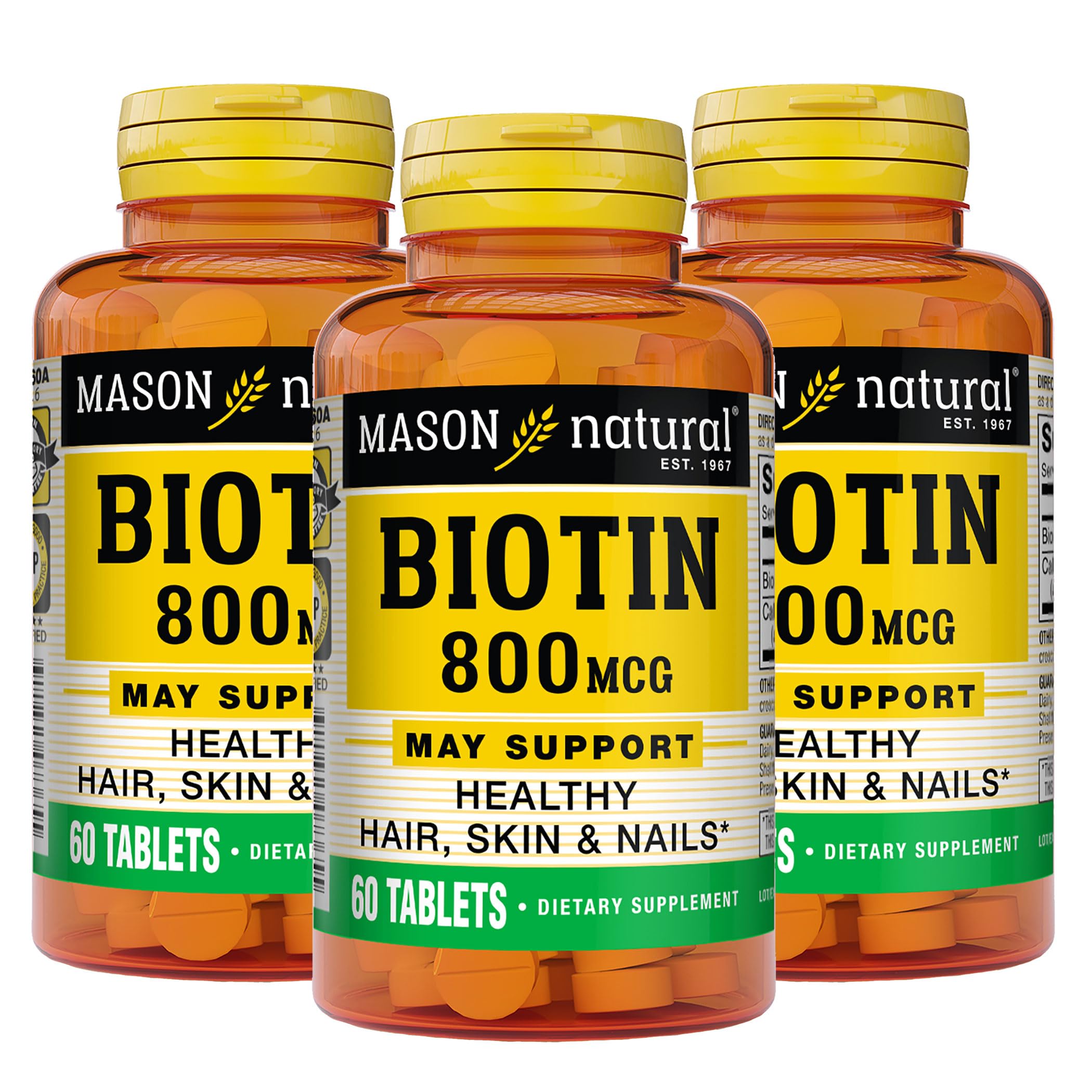 Support your beauty from the inside out with Mason Natural Biotin 800 mcg Tablets, a daily dietary supplement designed to help promote the strength and appearance of hair, skin, and nails. Biotin, also known as Vitamin B7, plays a vital role in amino acid metabolism—key to producing keratin, the essential structural protein found in hair and nails. A deficiency in biotin may lead to brittle nails, thinning hair, or dry, scaly skin. Our 800 mcg high-potency formula offers 2670 of the recommended daily intake, helping to ensure your body receives consistent support for these important beauty functions. Each tablet also includes 62 mg of calcium, adding further benefit to bone and nail health. This clean-label supplement is free from artificial additives and common allergens, making it a safe, effective addition to any daily wellness routine. Since biotin is water-soluble and not stored by the body, daily intake is important. With three 60-tablet bottles included, you'll have a 3-month supply of beauty-enhancing nutrition at your fingertips. Mason Natural has been a trusted name in wellness for generations. Explore our full line of supplements—from collagen and zinc to probiotics and antioxidants—and invest in your everyday health.TRUSTED FOR OVER 50 YEARS: Mason Natural has produced quality vitamin supplements for over five decades, adhering to cGMPs (current Good Manufacturing Practices) and US guidelines with rigorous testing inspections. CLEAN, ALLERGEN-FREE FORMULA: No added sugar, starch, gluten, dairy, soy, peanuts, eggs, shellfish, tree nuts, or artificial colors, flavors, or preservatives. Sodium and yeast free. IDEAL FOR DAILY WELLNESS: Each serving provides 2670 of the Recommended Dietary Intake of Biotin and includes 62 mg of calcium for added support. PROMOTES KERATIN PRODUCTION: May stimulate amino acid production essential for keratin formation, the structural protein that supports healthy hair growth and nail strength. SUPPORTS HAIR, SKIN NAIL HEALTH: Delivers 800 mcg of high-potency Biotin (Vitamin B7) to help strengthen hair strands, nourish skin, and support strong nails.