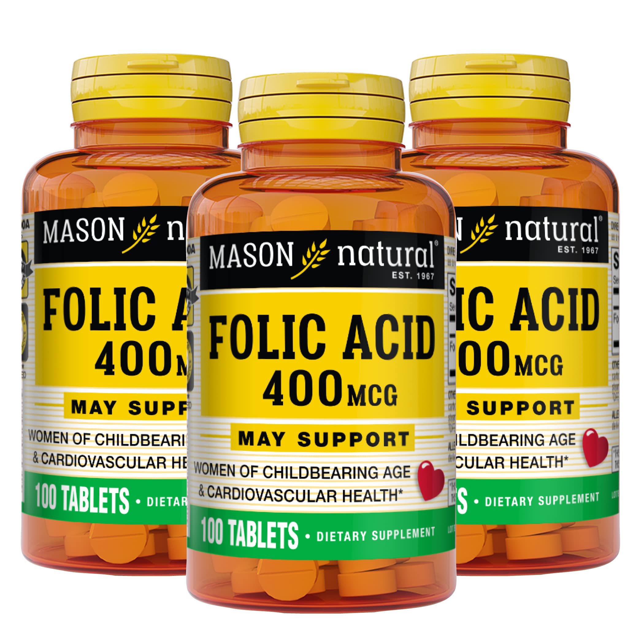 Mason Natural Folic Acid 400 mcg Daily Supplement for Health Mood and Prenatal Care for Women of Childbearing Age 100 Tablets (Pack of 3)