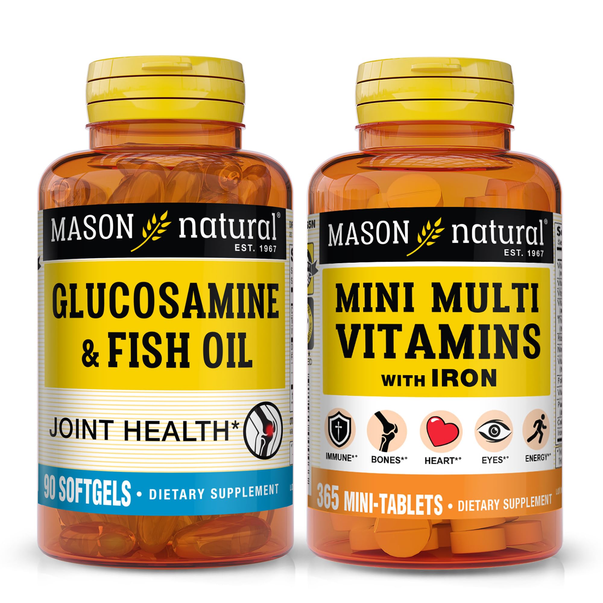 TRUSTED FOR OVER 50 YEARS: Mason Natural has produced quality vitamin supplements for over five decades, adhering to cGMPs (current Good Manufacturing Practices) and US guidelines with rigorous testing inspections. CLEAN INGREDIENTS: No added yeast, wheat, dairy, egg, artificial flavors or preservatives. JOINT MOBILITY: Glucosamine is a natural compound found in the body that may help support joint health and flexibility. KEY NUTRIENTS: Includes glucosamine sulfate, fish oil (EPA DHA), plus a daily multivitamin with iron and essential vitamins to help fill nutritional gaps. DAILY WELLNESS: Convenient two-in-one bundle combining glucosamine with a daily multivitamin to help support overall health.