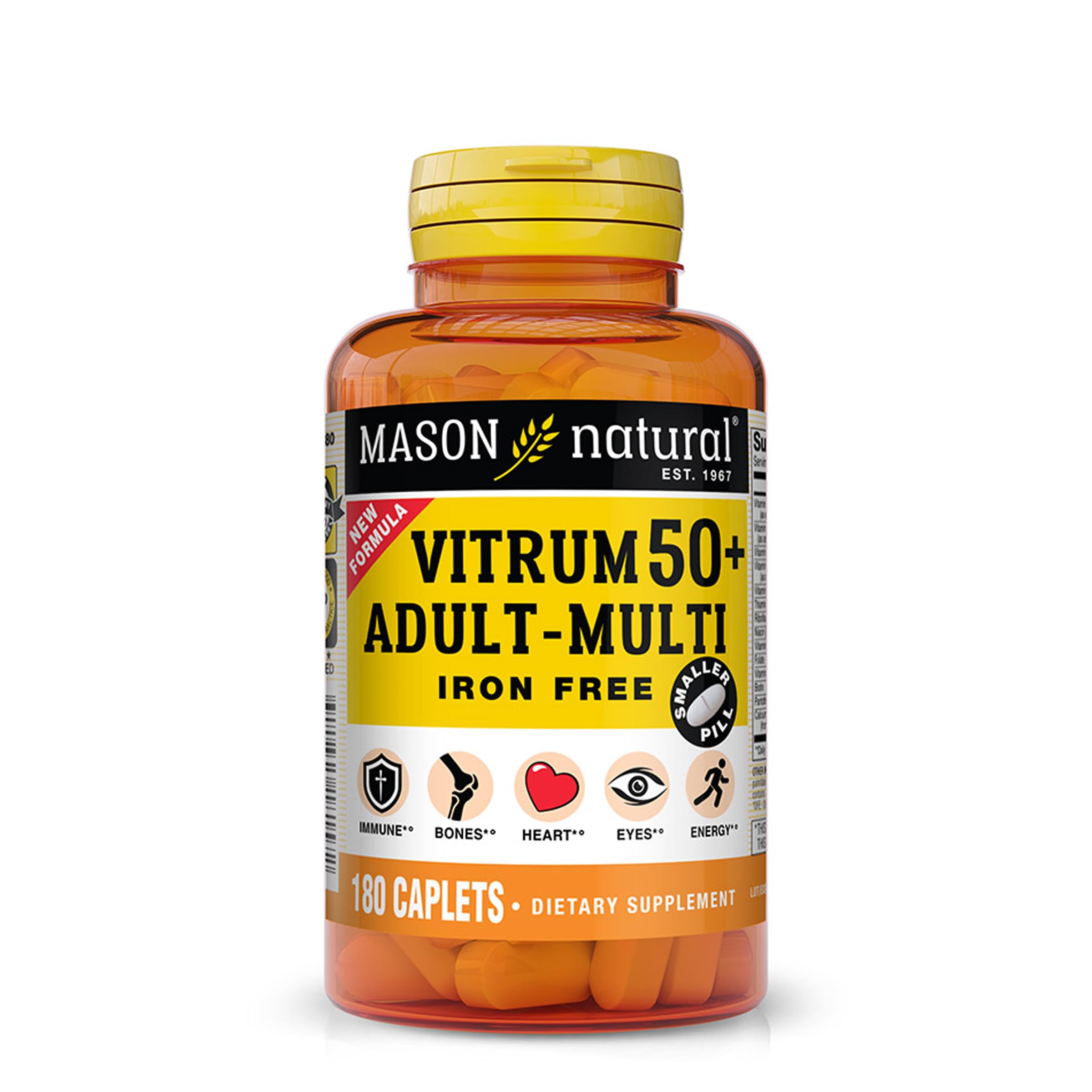 Vitrum 50 is a carefully formulated daily multiple vitamin for women and men over the age of 50. It's an iron-free multivitamin specially formulated with over 30 different nutrients that may help support many essential functions including healthy immunity, eye health, and healthy cell development and function. Vitamin D is known to assist in the intestinal absorption and utilization of calcium. The B-complex vitamins folic acid, B12, B1, B2, B6, niacin and pantothenic acid are known to support the conversion of food to energy and healthy energy levels, red blood cell production, and healthy cardiovascular, pulmonary, and neurological function. Vitamins A, C and E helps may help to support the body's antioxidant defense by helping to neutralize toxic free radicals. Our Daily Multiple Vitamins formula for adults over 50 provides a foundation of nutrition to ensure the body maintains optimal health and well-being.THE BEST VITAMINS FOR OVER 50 YEARS: For more than five decades, Mason Natural has produced quality vitamin supplements under cGMPs and adhering to US guidelines. All ingredients and finished goods are subjected to rigorous analytical testing, inspections and quality auditing. NO BAD STUFF: Gluten Free. Soy Free. Guaranteed no added Yeast, Soy, Wheat, Dairy, Fish, Tree Nuts, Peanuts, Egg, Fragrance, Artificial Flavors, Animal Products, Crustacean Shellfish. Sodium Free. JUST FOR YOU: A popular daily vitamin for women and men over the age of 5, specially formulated to ensure a foundation of nutrition to help the body maintain optimal health and well-being. ALL IN ONE: Contains B-vitamins, vitamin A, vitamin C, vitamin E, vitamin D, calcium, and trace minerals that provide a good foundation of nutrition support. FULL SPECTRUM MULTI: With over 30 essential nutrients, it may help support the many essential functions in the body, and general health and well-being.