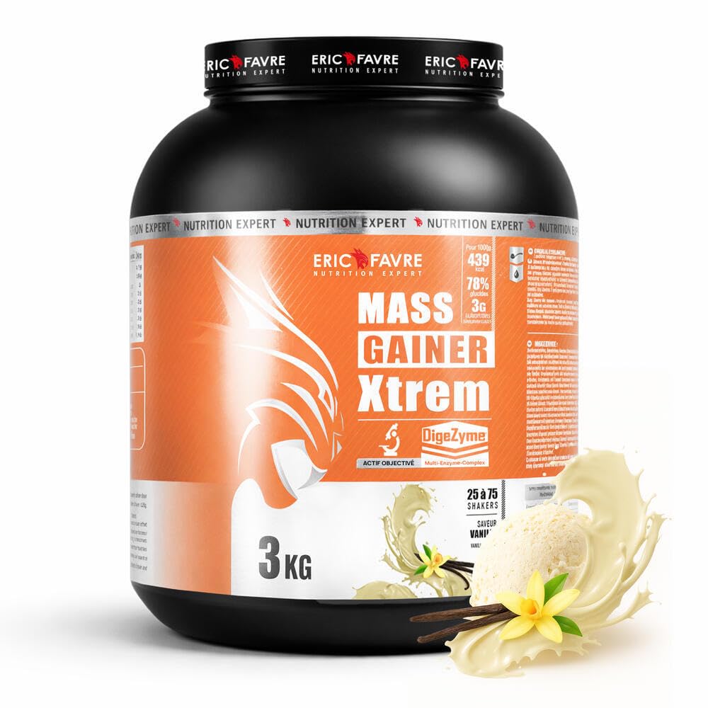 MASS GAINER XTREM avec CREATINE - Gainer Prise de Masse - 433 kcal 94g Glucides 3g Cr atine Whey + Digezyme - 3kg - Saveur Vanille - Eric Favre 3kg Vanille