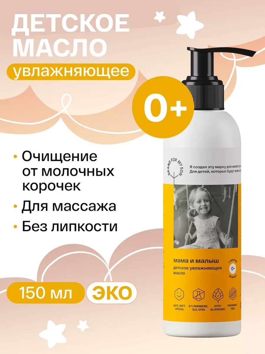Увлажняющее масло «Мама и малыш» Brand For My Son - важное для ежедневного ухода за кожей малыша средство, предназначенное для очищения и питания, увлажнения и массажа. Базовый косметический продукт для новорожденных с первых дней жизни создан с целью деликатного очищения от молочных корочек. Он помогает деликатно убрать корочки, питает, успокаивает и не оставляет липких следов. В составе каприлик, который смягчает и увлажняет, а также растительный сквалан с противогрибковыми и противовоспалительными свойствами для ускорения заживления, восстановления и обновления. Натуральное масло жожоба идеально питает и предупреждает потерю влаги, способствует быстрому очищению, избавляет от шелушения. Уходовый премиум - продукт помогает естественному очищению кожных складочек на шее, ручках и ножках младенца - девочки или мальчика. Во время массажа способствует очень легкому скольжению, успокаивает и увлажняет после купания в ванне. Для избавления от корочек в области кожных складок и местах соприкосновения с подгузником наносите мультифункциональное средство в формате масла на ватный диск (несколько капель) и очищайте для облегчения избавления от корочек. Для избавления от сухости - распределяйте мягкими движениями, а для массажных процедур в домашних условиях - разогрейте питательное premium - средство в руках и наносите на поверхность тела ребенка перед массажем. Подходит для любого типа эпидермиса маленького ребенка, в том числе чувствительного и проблемного. Результат комплексного воздействия и эффективного восстанавливающего супер - ухода - здоровьe, гладкость и красота, профилактика воспалений и раздражений, сухости и других проблем. Поставляется в красивом флаконе (объем 150 мл) с дозатором удобного для распределения средства размера, в защитной упаковке для сохранности в процессе доставки из нашего магазина. Сделано в России. У нас есть акции и распродажи, вы можете купить наши товары в подарок со скидкой!