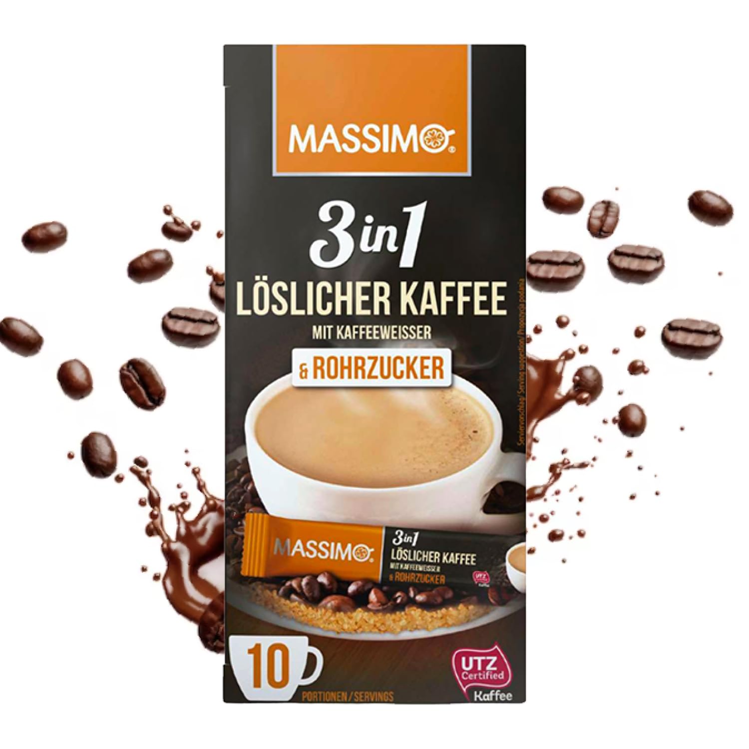 MASSIMO - Instant Coffee 3 in 1 with white coffee sugar and cane sugar 170 g x 16 powdered drink packs with instant coffee, white coffee sugar and brown cane sugar INGREDIENTS Sugar, coffee white (glucose syrup, whole coconut fat, milk proteins, stabilizer: potassium phosphates, polyphosphates, emulsifier: mono- and diglycerides of food fatty acids, mono- and diacetyl tartaric acid esters of mono- and diglycerides of food fatty acids) 35 , instant coffee beans 10 , brown cane sugar 10 .Storage pack: Enjoy the practical pack of Massimo 3-in-1 coffee sticks now. A total of 16 packs of 10 individual sachets. But the size of the package can make the whole family happy. The soluble powder allows for easy and quick preparation of a tasty cup of coffee. Massimo makes it possible: instant coffee sticks with everything a good coffee needs – all in one pack. Save time: easy preparation – simply add the MASSIMO 3-in-1 coffee stick to your cup, pour hot water or milk, stir and enjoy. All-in-one instant coffee for immediate enjoyment: 160 sticks of 17g powdered beverage with high-quality soluble coffee, white coffee and brown cane sugar. The coffee moment that makes you happy. ITALIAN TO GO: Enjoy Massimo coffee like in Italy, anytime and anywhere. Before a meal, after a main course, or as the perfect start to the day. Our goal: to enjoy quickly and comfortably—but with an Italian touch and style. MASSIMO - Café soluble 3 en 1 avec sucre blanc de café et sucre de canne 170 g x 16 paquets de boissons en poudre avec café soluble, sucre blanc café et sucre de canne brun INGRÉDIENTS Sucre, blanc de café (sirop de glucose, graisse de noix de coco entière, protéines de lait, stabilisateur : phosphates de potassium, polyphosphates, émulsifiant : mono- et diglycérides d'acides gras alimentaires, esters mono- et diacétyliques d'acide tartrique de mono- et diglycérides d'acides gras alimentaires) 35 , café à grains solubles. 10 , marron Sucre de canne 10 .Pack de conservation : profitez dès maintenant du pack pratique de bâtonnets de café Massimo 3 en 1. Un total de 16 paquets de 10 sachets individuels. Mais la taille de l'emballage peut rendre toute la famille heureuse. La poudre soluble permet une préparation facile et rapide d'une tasse de café savoureuse. Massimo rend cela possible : des bâtonnets de café instantanés avec tout ce dont un bon café a besoin – le tout dans un seul paquet. Gagnez du temps : préparation facile – il suffit d'ajouter le bâton de café 3 en 1 MASSIMO dans votre tasse, de verser de l'eau chaude ou du lait, de remuer et de profiter. Un café instantané tout en un pour un plaisir immédiat : 160 bâtonnets de 17 g de boisson en poudre avec du café soluble de haute qualité, du café blanc et du sucre de canne brun. Le moment du café qui vous rend heureux. ITALIEN TO GO : profitez du café Massimo comme en Italie, à tout moment et n'importe où. Avant le repas, après le plat principal, ou comme parfait début de journée. Notre objectif : profiter rapidement et confortablement - mais avec une touche et un style italiens.