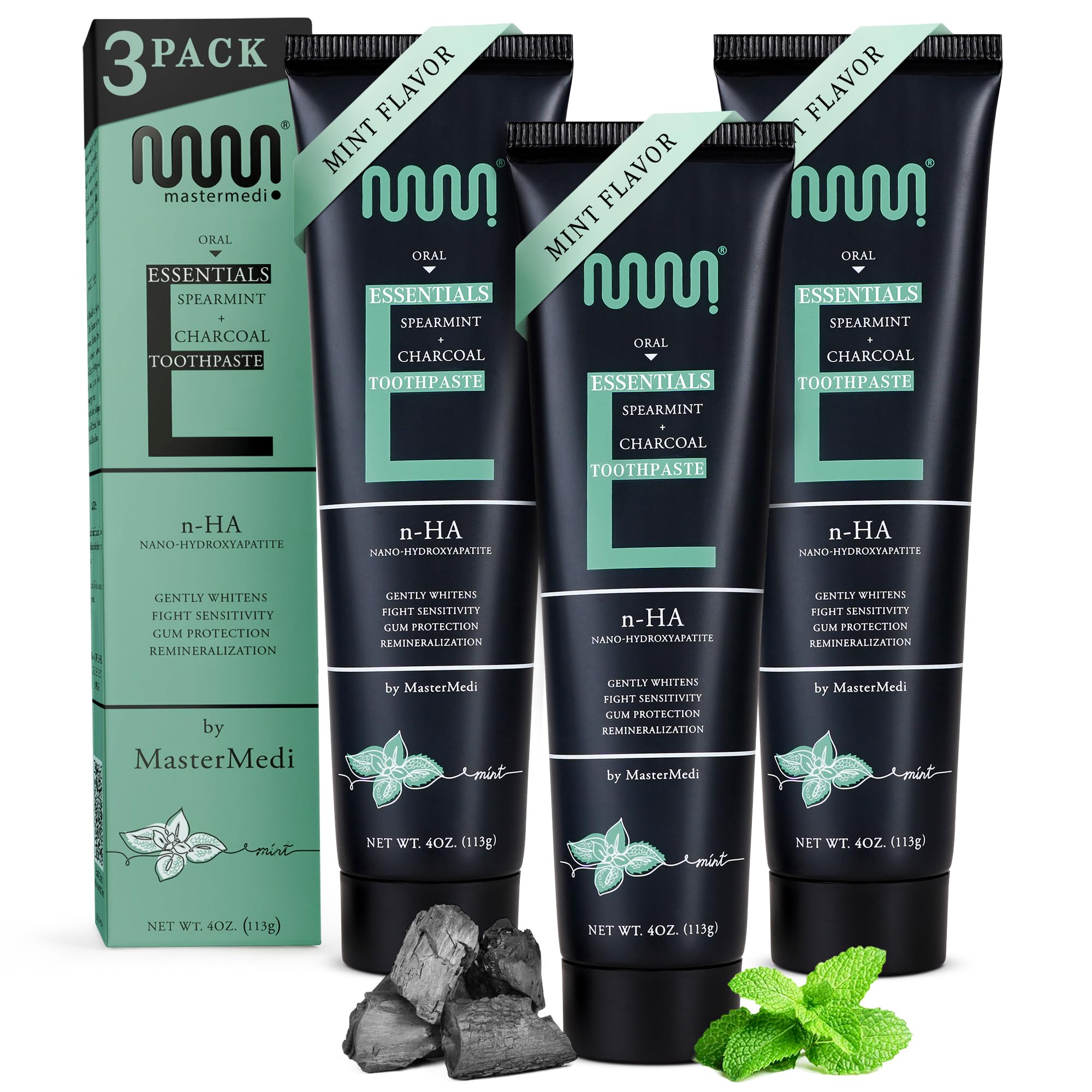 Elevate your brushing routine with MasterMedi Charcoal Toothpaste with Nano Hydroxyapatite, a powerful yet gentle formula designed to deliver a deep clean, fresh breath, and long-term enamel support — without the use of fluoride, SLS, or harsh abrasives. This unique blend combines activated charcoal to help remove surface stains and impurities with Nano Hydroxyapatite, a mineral that supports tooth remineralization and sensitivity relief. Unlike gritty or overly abrasive charcoal pastes, our formula is safe for everyday use and helps brighten your smile without damaging enamel. Enjoy the cool, crisp flavor of natural spearmint, which leaves your breath feeling fresh and clean all day long. Whether you're looking for a fluoride-free toothpaste, a natural whitening option, or a toothpaste for sensitive teeth, this charcoal-infused blend is a smart and effective choice. Made with vegan, non-toxic ingredients, free from BPA, artificial colors, and animal testing — because clean teeth deserve a clean conscience.CLEAN FORMULA, CLEAN CONSCIENCE Vegan, BPA-Free, and never tested on animals. We're committed to clean ingredients that support your oral health — and your values. REFRESHING SPEARMINT FLAVOR Cool, crisp Spearmint delivers long-lasting freshness and a clean-mouth feel you'll love — perfect for morning and night brushing. NATURAL WHITENING WITHOUT HARSH ABRASIVES Charcoal works with fruit enzymes to gently polish and brighten teeth — without peroxide, bleach, or gritty texture. FLUORIDE-FREE SAFE FOR DAILY USE This fluoride-free, SLS-free formula is ideal for those seeking a natural toothpaste that supports sensitivity relief and everyday enamel care. DETOXIFYING CHARCOAL NANO HYDROXYAPATITE Infused with gentle activated charcoal and enamel-supporting Nano Hydroxyapatite to help lift surface stains and promote cleaner, healthier teeth.