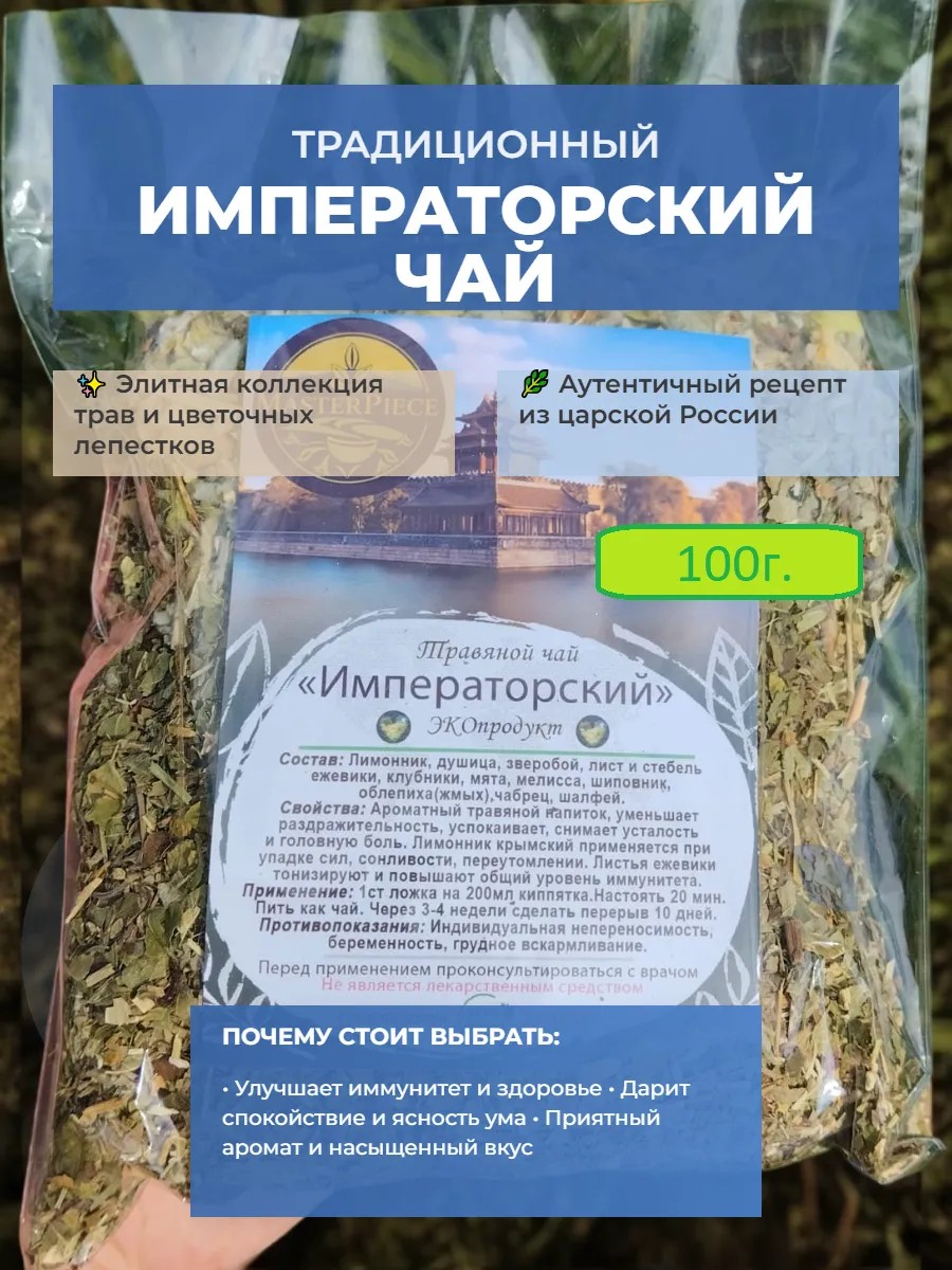 Познакомьтесь с травяным чаем "Императорский" от MasterPiece – настоящим кладезем полезных трав! Этот ароматный напиток, собранный из тщательно отобранных компонентов, подарит вам настоящий праздник вкуса и аромата. Представьте: лимонник, душица, зверобой, ежевика, клубника, мята, мелисса, шиповник, облепиха, чабрец и шалфей – все эти травы, известные своими целебными свойствами, собраны в одном пакетике. "Императорский" – это не просто сбор, это настоящий ритуал заботы о себе. Насладитесь его неповторимым вкусом и ароматом, почувствуйте, как мягко окутывает вас тепло и уют. Этот сбор станет вашим верным спутником в любой ситуации: утром он бодрит и заряжает энергией, днем дарит спокойствие и умиротворение, а вечером помогает расслабиться и подготовиться ко сну.Свойства: Ароматный травяной напиток, уменьшает раздражительность, успокаивает, снимает усталость и головную боль. Лимонник крымский применяется при упадке сил , сонливости, переутомлении. Листья ежевики тонизируют и повышают общий уровень имуннитета.