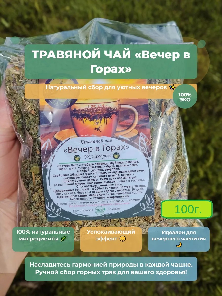 Представьте себе: уютный вечер, тишина и аромат травяного чая MasterPiece "Вечер в горах". Этот чай – настоящий подарок для тех, кто ценит натуральные вкусы и заботится о своем здоровье. В его состав входят толькоcarefully selected натуральные травы: лист и стебель ежевики, клубники, лаванда, кизил, мята, тысячелистник, чабрец, льняное семя, шалфей, душица и зверобой. Каждый глоток наполнит вас спокойствием и умиротворением, помогая расслабиться после насыщенного дня. Чай упакован в индивидуальную упаковку "БОПП", что сохраняет его свежесть и аромат. "Вечер в горах" – это не просто напиток, это ритуал заботы о себе, возможность насладиться моментом и подарить себе маленькуюPause счастья.Свойства: обладает желчегонным, очищающим действием, регулирует работу желчного пузыря, печени и поджелудочной железы. Семя льна нормализует расщепление жиров. Шиповник выводит шлаки и токсины. Способствует снижению веса.