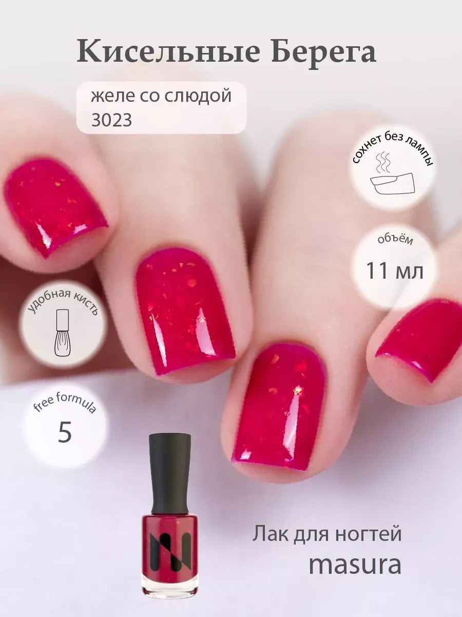 Лак MASURA «Кисельные Берега» - малиновое желе с мульхромной (золостисто-оранжево-розовой слюдой). Лак с потрясающе красивым наполнением и приятной текстурой. Он легко наносится и высыхает на воздухе, не требуя применения лампы. Лак подходит для домашнего использования и для салонов красоты.