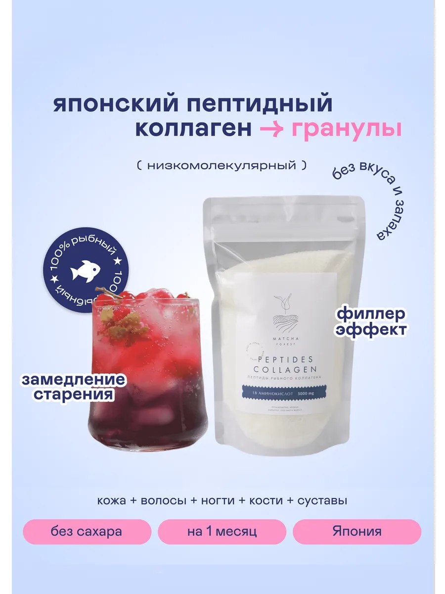 Пептиды рыбного коллагена от матча форест сделаны в ЯПОНИИ. Японские пептиды рыбного коллагена производятся из 100% чешуи и кожи белой рыбы.- **Эффект от приема:**1. Уменьшение глубины морщин, восстановление эластичности кожи, торможение процессов старения.2. Помощь в лечении акне и кожных аллергий. 3. Укрепление волос, ногтей, костей. 4. Помощь в лечении остеохондроза, артрозов, ревматических поражений суставов. 5. Устранение боли в суставах и костях. 6. Ускорение заживления ран, регенерация кожи. 7. Стимуляция роста мышечной ткани в процессе занятий спортом. - Стандартная суточная доза 5г или 1 столовая ложка гранул коллагена. ( Коллаген порошок , Японский коллаген, гидролизованный коллаген, коллаген для суставов, рыбный коллаген).