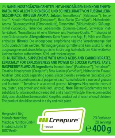 High -quality ingredients ? The recipe was developed by nutritionists taking into account the latest scientific studies.Recurring effect ? In contrast to classic fitness boosters, we do not use caffeine - so your body does not get used to the effect.Mix.Drink.Boost ? Simply mix, shak and drink 20 minutes before training 20 g boost with 300 ml of water.Especially for footballers ? The ATP-Boost-Matrix developed by experts ensures long-lasting energy, so you have strength for sprints and passes.90 minutes Power ? BOOST gives you more strength, explosiveness and endurance with the perfect combination of carbohydrates and highly functional amino acids.
