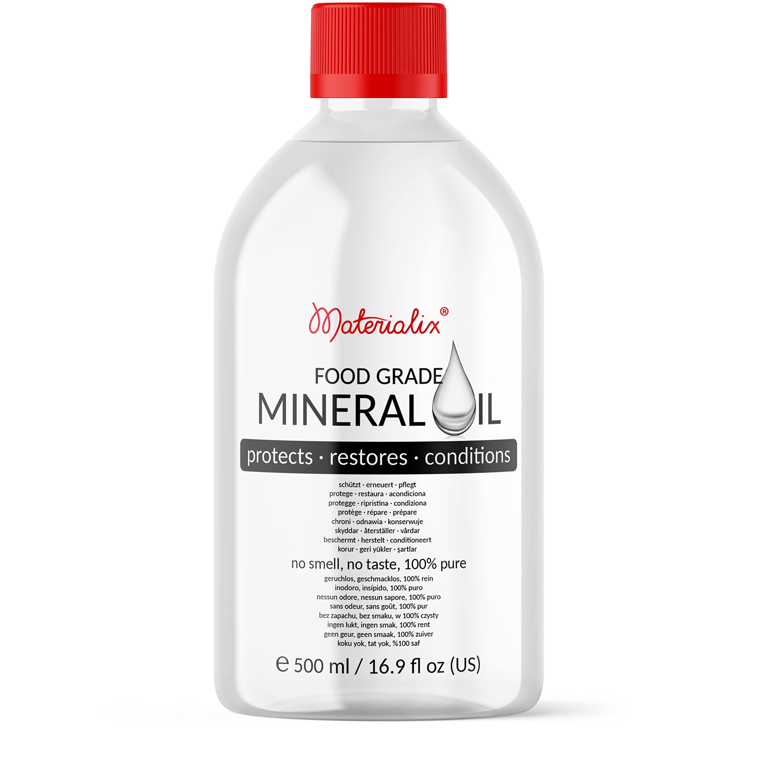 Materialix Food Grade Mineral Oil is a taste and odorless mineral oil that is suitable for products such as wood, bamboo, stone, slate, dyi cosmetics, balm, creams, lotions, hair care, bathing products, ointments.Our mineral oil does not contain any additives.warning: never overheat the oil.Vapors are slightly inflammatory.Keep away from fire.Made under GMP conditions.Conditions: keeps wood and stone moist, dismisses water and does not evaporate.Restored: gives dry and blunt surfaces a completely new look.Protects: cutting boards, butcher blocks, worktops, wooden bowls and kitchen utensils.Compared to other oils or growing, our oil penetrates deep into wood fibers and rock thanks to its extremely low viscosity and gives its products a long -lasting protection.Materialix mineral oil in food quality is a taste and odorless mineral oil that is suitable for products such as wood, bamboo, stone, slate, dyi cosmetics, balm, creams, lotions, hair care, bathing products, ointments.Our mineral oil does not contain any additives.Materialix Food Grade Mineral Oil ist ein geschmacks- und geruchloses Mineralöl, das sich für Produkte wie Holz, Bambus, Stein, Schiefer, DYI-Kosmetik, Balsame, Cremes, Lotionen, Haarpflege, Badeprodukte, Salben eignet. Unser Mineralöl enthält keine Zusatzstoffe.WARNUNG: Das Öl niemals überhitzen. Dämpfe sind leicht entzündlich. Von Feuer fernhalten. Hergestellt unter GMP-Bedingungen. BEDINGUNGEN: Hält Holz und Stein feucht, weist Wasser ab und verdunstet nicht. RESTAURIERT: verleiht trockenen und stumpfen Oberflächen ein ganz neues Aussehen. SCHÜTZT: Schneidebretter, Metzgerblöcke, Arbeitsplatten, Holzschüsseln und Küchenutensilien. Im Vergleich zu anderen Ölen oder Wachsen dringt unser Öl dank seiner extrem niedrigen Viskosität tief in Holzfasern und Gestein ein und gibt Ihren Produkten einen länger anhaltenden Schutz. Materialix Mineralöl in Lebensmittelqualität ist ein geschmacks- und geruchloses Mineralöl, das sich für Produkte wie Holz, Bambus, Stein, Schiefer, DYI-Kosmetik, Balsame, Cremes, Lotionen, Haarpflege, Badeprodukte, Salben eignet. Unser Mineralöl enthält keine Zusatzstoffe.