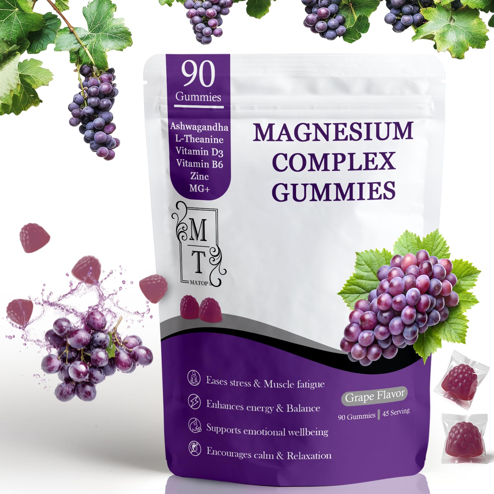 5 ? Premium Quality You Can Trust: Made in a GMP-certified facility in the USA, non-GMO, vegan, gluten-free, and third-party tested for purity and potency — formulated for those who value science-driven nutrition. . 4 ? Daily Vegan Gummies You'll Look Forward To: Delicious Grape-flavored gummies made for adults — 2 gummies per serving, no artificial colors or gelatin, and crafted for an enjoyable daily routine. . 3 ? Essential Nutrients for Muscle Nerve Function: Vitamin D3, Vitamin B6, and Zinc work together with Magnesium to help maintain healthy muscle function, nerve communication, and overall wellness. . 2 ? Support Stress Anxiety Relief: Rapid relaxation from L-Theanine sustained cortisol reduction from Ashwagandha for comprehensive calm. . 1 ? Triple Magnesium Complex for Energy Balance: Formulated with Magnesium Glycinate, Malate, and Citrate to help support steady energy production, calm focus, and balanced mood — gentle on digestion and designed for optimal absorption. .