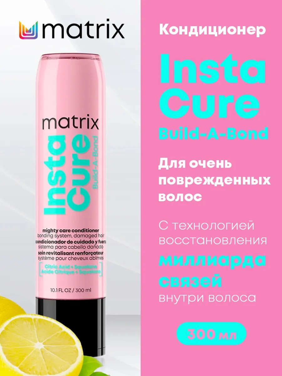 Профессиональный кондиционер для поврежденных волос MATRIX Instacure Build-A-Bond (Инстакьюр Билд-А-Бонд), 300 мл – для восстановления волос, пострадавших от окрашивания, обесцвечивания, применения термоинструментов или других стресс-факторов. Благодаря технологии восстановления миллиарда связей истонченные и ломкие волосы становятся в 8 раз сильнее.* Разглаживающий бондинг-кондиционер – второй этап профессиональной системы ухода Instacure Build-A-Bond для поврежденных волос. Гамма идеально подходит для тех, кто думает, что волосы уже не спасти. 83% потребителей отмечают, что волосы словно оживают после применения гаммы.** Восстанавливающий кондиционер Instacure Build-A-Bond содержит в составе лимонную кислоту и сквалан. Формула кондиционера способствует питанию и активному укреплению волос изнутри, смягчению и разглаживанию снаружи, легкому расчесыванию и защите от дальнейших повреждений. Свежий аромат раскрывается при нанесении нотами пиона, лимона и мускуса. Добивайтесь укрепления, гладкости и мягкости поврежденных волос с помощью комплексного ухода Instacure Build-A-Bond. Шаг 1: бондинг-шампунь очищает и восстанавливает волосы изнутри и снаружи. Шаг 2: бондинг-кондиционер способствует их разглаживанию и укреплению без утяжеления. 1 – 2 раза в неделю вместо него может быть использована жидкая маска для восстановления и защиты волос от повреждений. Шаг 3: завершает уход несмываемый запечатывающий бальзам с термозащитой. * Потребительский тест при использовании шампуня-бондинга, кондиционера, маски и бондинг-бальзама, 54 респондента. ** Инструментальный тест при использовании шампуня-бондинга, кондиционера, маски и бондинг-бальзама.