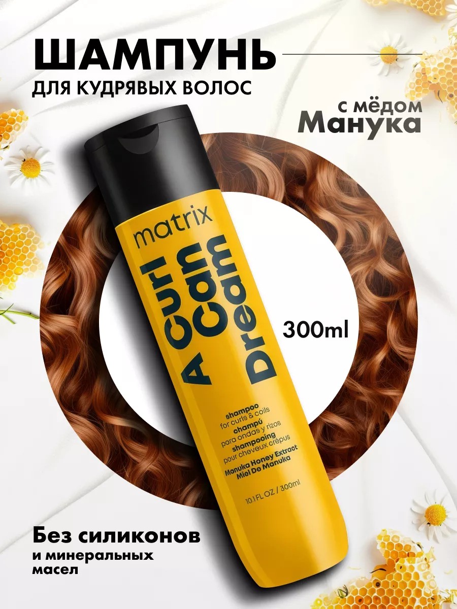 Matrix A Curl Can Dream professional shampoo for curly and frizzy hair with Manuka honey extract intensively cleanses, removes buildup, and moisturizes and nourishes porous curly hair, helping to create beautiful, bouncy curls. Free of silicones and mineral oils. The fragrance opens with notes of rose, peony, sea salt, lily of the valley, and jasmine. How to use: Apply the required amount of shampoo to the scalp, lather, and rinse thoroughly along the lengths and ends. Rinse with water. Then apply the A Curl Can Dream mask and light hold gel. Dear customers, Matrix in Russia is gradually updating its Total Results care products, so you may receive shampoo in both the new and previous designs.