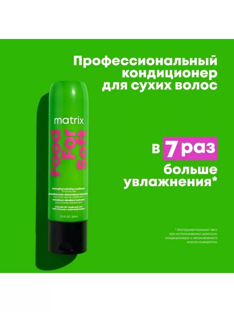 Увлажняющий кондиционер Matrix Food For Soft питает и увлажняет волосы, придает им мягкость, облегчает расчесывание. АКТИВНЫЕ ИНГРЕДИЕНТЫ: Масло авокадо помогает сохранить волосы увлажненными и мягкими, способствует облегчению расчесывания. Гиалуроновая кислота глубоко увлажняет волосы. Витамин E (токоферол) укрепляет собственную антиоксидантную защиту. Масло подсолнечника обладает питательными свойствами, обеспечивает смягчение и восстановление поврежденных волос. СПОСОБ ПРИМЕНЕНИЯ: После мытья с шампунем Food For Soft нанести кондиционер от середины длины до кончиков, оставить на 1 минуту. Смыть водой. При попадании в глаза промыть их водой. ЭФФЕКТИВНОСТЬ: Профессиональный кондиционер Food For Soft предназначен для домашнего и салонного ухода за сухими волосами. Ухаживающая формула с авокадовым маслом и гиалуроном (гиалуронкой) обеспечивает питание, увлажнение и укрепление волос. Косметическое средство помогает сохранить объем и красоту волос, придает им мягкость и гладкость. Увлажняющая система Food For Soft делает волосы в 7 раз мягче![1]Уходовый кондиционер подходит для применения каждый день. Аромат кондиционера раскрывается нотами ириски и ванили. А легкие нюансы жасмина и фрезии разбавляют сладкую ванильную композицию. 1. Инструментальный тест, при использовании системы Food For Soft из шампуня, кондиционера, несмываемого масла-сыворотки. *Вы также можете найти данное средство по запросам: бальзам для пористых волос; уход для поврежденных волос; кондиционер для обесцвеченных волос; косметическое средство против сухости волос. Matrix Food For Soft – Кондиционер для сухих волос, 300 мл. Для лучшего эффекта попробуйте увлажняющую трех-этапную систему Matrix Food for Soft, состоящую из шампуня, кондиционера и масла для волос.
