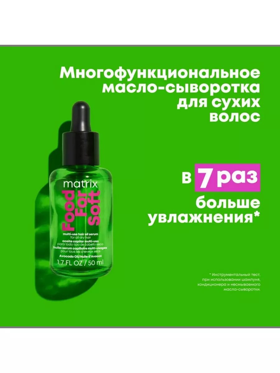 Многофункциональное масло-сыворотка Matrix Food For Soft обеспечивает термозащиту до 230°C[1], усиливает блеск и гладкость волос, делает их заметно более мягкими на 72 часа[2]. АКТИВНЫЕ ИНГРЕДИЕНТЫ: Масло авокадо образует невидимую защитную пленку, которая предотвращает сухость и повреждение волос, помогает обеспечить увлажнение и дисциплину непослушных прядей. Витамин E (токоферол) укрепляет собственную антиоксидантную защиту. Масло подсолнечника обеспечивает питание и смягчение волос. Экстракт розмарина улучшает микроциркуляцию кожи головы и стимулирует рост волос. СПОСОБ ПРИМЕНЕНИЯ: После мытья с шампунем и кондиционером Food For Soft нанести несколько капель масла-сыворотки на влажные или сухие волосы, не смывать. При попадании в глаза немедленно промыть их водой. Для лучшего эффекта попробуйте увлажняющую трех-этапную систему Matrix Food for Soft, состоящую из шампуня, кондиционера и масла для волос. ЭФФЕКТИВНОСТЬ: Профессиональное масло-сыворотка Matrix Food For Soft разработано для домашнего и салонного ухода за сухими волосами. Несмываемый уход, снимающий признаки сухости, обеспечивает увлажняющий, питательный и термозащитный эффект, придает волосам мягкость и визуально уменьшает секущиеся кончики. Сыворотка с авокадовым маслом помогает сохранить густоту, красоту и сияющий цвет волос, способствует легкому расчесыванию. Увлажняющая система Food For Soft делает волосы в 7 раз мягче![3]Парфюмированная композиция раскрывается сладкими нотами ириски и ванили. А легкие нюансы жасмина и фрезии разбавляют ванильный аромат косметики. 1. Инструментальный тест.2. Потребительский тест, 109 человек. 3. Инструментальный тест, при использовании системы Food For Soft из шампуня, кондиционера, несмываемого масла-сыворотки. *Вы также можете найти данное средство по запросам: масло для пористых волос; уход для поврежденных волос; сыворотка для обесцвеченных волос; косметическое средство против сухости волос.