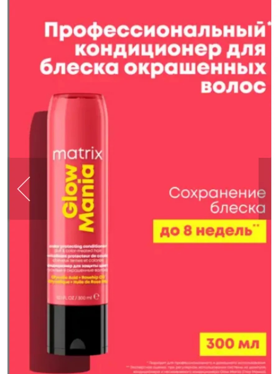 Glow Mania Professional Conditioner, 300 ml, for color protection and long-lasting shine - suitable for color-treated and dull hair, restores shine and smoothness, and ensures easy combing. This conditioner gently detangles hair, preserving the radiance of color from within. This conditioner is an essential step in the professional Glow Mania system, designed to protect color and maintain the shine of dull hair for up to 8 weeks*. Under the influence of stress factors (coloring, frequent styling, intensive brushing, use of heat tools), hair can lose its natural shine - this is due to the fact that its damaged surface stops reflecting light. The Glow Mania range works to restore hair's radiance from the inside and out, making hair 3 times* shinier. Glycolic acid, which has the smallest molecule of all AHA acids and easily penetrates the hair structure, is responsible for the glossy shine from within. Long-lasting shine is maintained from the outside by rosehip oil (an excellent source of vitamin C), which has a laminating effect—sealing damaged cuticles and ensuring their tight adherence. Hair begins to reflect light again and shines confidently and luxuriously. Using all products in the Glow Mania range will help maintain long-lasting shine, protect colour, and care for colour-treated hair. Step 1: Gently cleanse and protect colour with a sulfate-free shampoo. Step 2: Easy combing and glossy shine by applying conditioner from mid-lengths to ends (avoiding the scalp). Step 3: Preserve colour and shine by using a mask (once a week or instead of conditioner, if needed). Step 4: Perfect styling thanks to a leave-in conditioner, which also protects hair from daily stressors. *With regular use of the Glow Mania shampoo, conditioner/mask, and leave-in conditioner system.