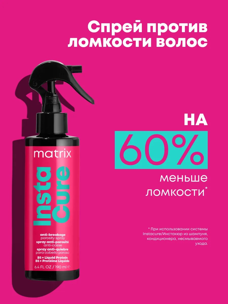 Matrix Instacure Professional Spray Against Breakage and Porosity normalizes the pH balance, provides nutrition, smoothing and disciplines hair. ACTIVE INGREDIENTS: Wheat protein strengthens hair, gives it shine and volume from roots to ends. Panthenol (provitamin B5) enhances the strengthening effect of the protein complex. Glycerin protects hair from dryness, provides a moisturizing and softening effect. HOW TO USE: After washing with Instacure shampoo and conditioner, apply the spray to clean, damp hair from mid-lengths to ends. Do not rinse. EFFECTIVENESS: Instacure Anti-Breakage Spray is designed for comprehensive home and salon care of very dry and damaged women's hair, including colored, highlighted and bleached hair. The Instacure care system reduces breakage by 60%.[1] The caring ingredients in the formula fill the cuticle structure, provide intensive nourishment and restoration, and reduce frizz and split ends. The spray's light texture adds softness, smoothness, and shine to hair, making it easier to detangle and comb curly, frizzy, and unruly locks. This leave-in spray restores, moisturizes, and smoothes fine, brittle, and split-end hair damaged by straightening, coloring, and bleaching. It makes hair smoother, acts as a moisturizer, and reconstructs hair. The fragrance of the range opens with notes of fresh ginger, lemongrass, and cedar. Nuances of green tea, freesia, and May rose soften the cedar and ginger perfume composition. 1. Instrumental test, using the Instacure shampoo, conditioner, and spray system.