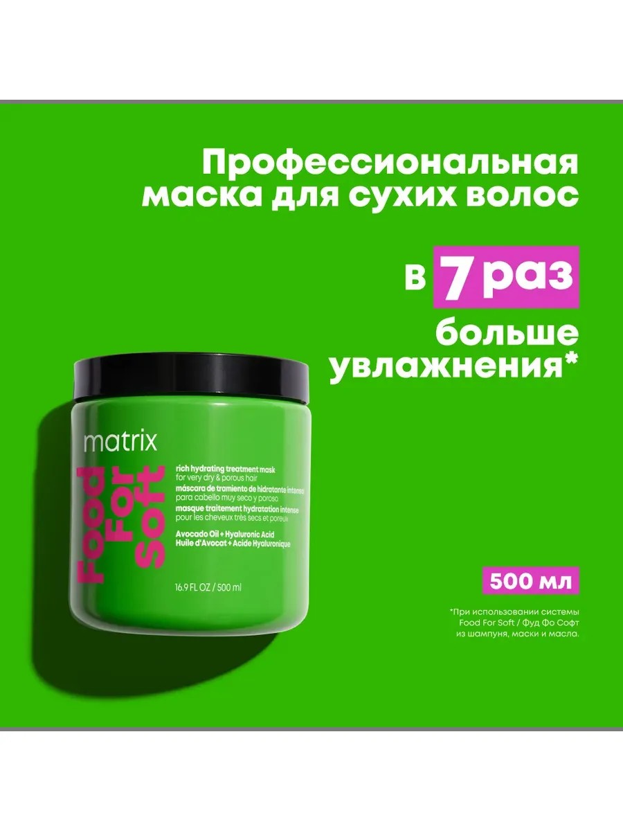 Профессиональная маска Matrix Food For Soft, 500 мл, для питания сухих и пористых волос интенсивно увлажняет обезвоженные волосы. Маска с гиалуроновой кислотой и маслом авокадо обеспечивает увлажнение сухих и очень сухих волос, делая их мягкими и шелковистыми. Не утяжеляет волосы у корней. Маска также сочетает в себе свойства бальзама-ухода, восстанавливая баланс влаги внутри пересушенных и пористых волос, а также делая пряди мягкими и эластичными. Маска подходит для любых типов сухих волос, включая окрашенные, жесткие, седые и поврежденные волосы от частого расчесывания и использования термоинструментов.