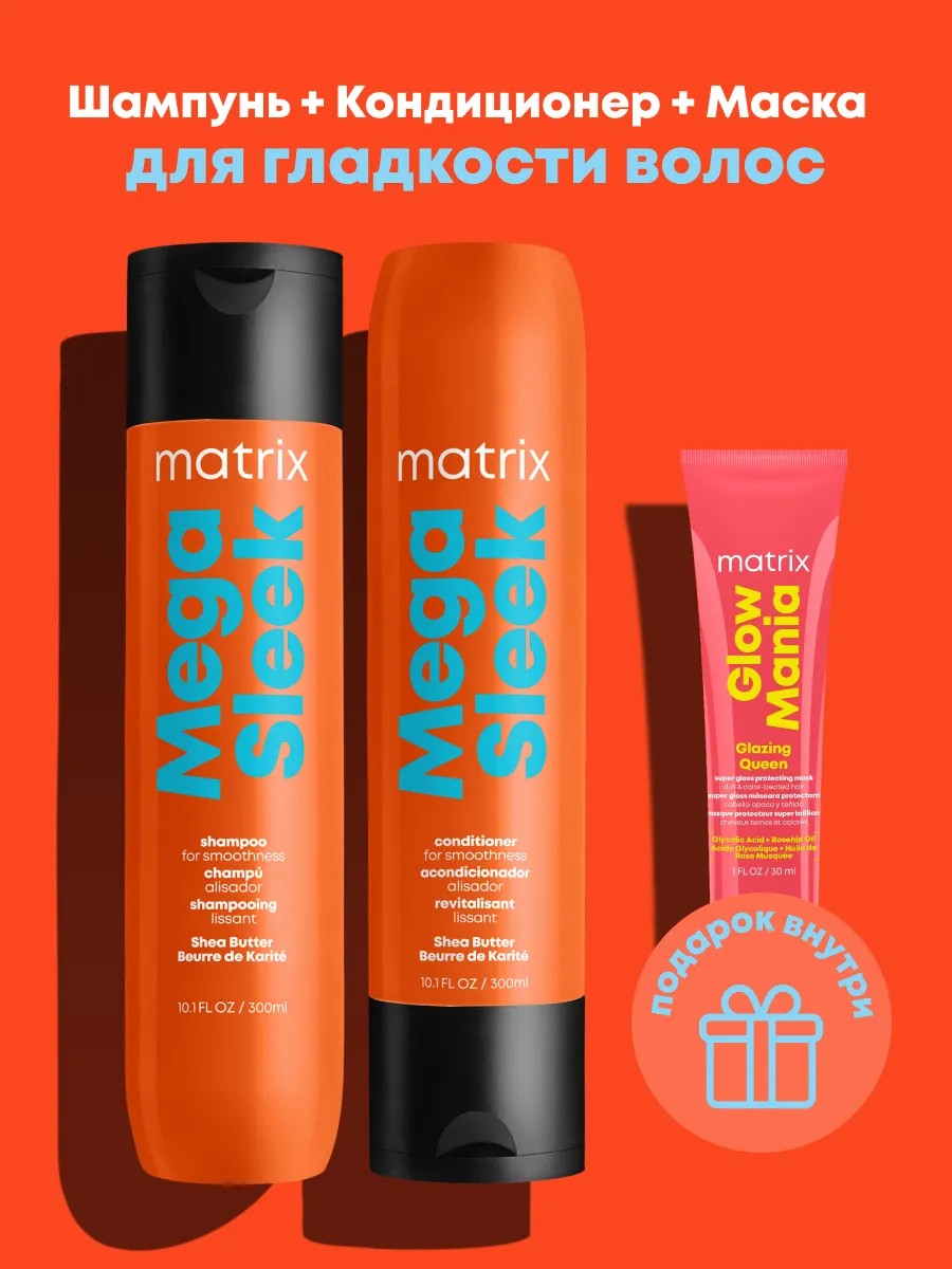 Встречай новую коллекцию наборов профессиональных уходов от Matrix. Теперь для повышения дисциплины и гладкости непослушных и окрашенных волос. Профессиональный шампунь Mega Sleek бережно очищает, делает волосы в 5 раз* более гладкими и устраняет пушистость. Масло ши в составе разглаживает волос и придает блеск. Профессиональный кондиционер Mega Sleek питает, делает волосы мягкими и послушными. Керамиды в составе эффективно увлажняют и восстанавливают структуру волоса.