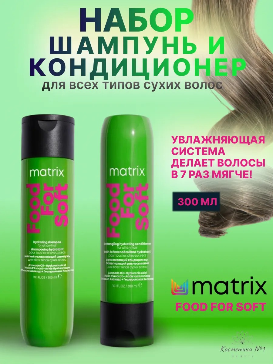 Матрикс шампунь нежно очищает, питает и увлажняет волосы, что особенно важно для их восстановления. Его формула заботится о волосах, придавая им здоровье и блеск. В сочетании с бальзамом matrix, который усиливает действие шампуня, вы получите уходовый набор для волос, достойный профессиональной заботы. Matrix шампунь для окрашенных волос обеспечивает защиту цвета, предотвращая вымывание и потемнение. Благодаря этому ваши волосы будут яркими и насыщенными дольше. Также в наборе представлен шампунь matrix для объема, который придаст вашим локонам легкость и воздушность. Для регулярного ухода за сухими, ломкими, поврежденными волосами MATRIX предлагает использовать увлажняющий кондиционер Food For Soft Detangling Hydrating Conditioner. Средство подходит для окрашенных прядей, оно зримо улучшает, смягчает и разглаживает волосы после химической завивки, горячей укладки и пребывания на солнце. Формула с гиалуроновой кислотой и маслом авокадо, богатым ценными питательными веществами и помогающим укрепить пористую структуру волос. Не забывайте, что набор ухода за волосами включает все необходимые продукты для комплексного ухода. Для тех, кто стремится к красоте волос, matrix для волос предлагает набор косметики для волос, который адаптирован под любую потребность. Набор уходовой косметики для волос станет вашей незаменимой палочкой-выручалочкой для защиты и увлажнения. Приобретая набор matrix, вы получаете не просто продукты, а полноценный комплект шампунь и кондиционер, который поможет изменить ваш подход к уходу за волосами. Эффективная формула матрикс для волос гарантирует отличные результаты, и вы заметите разницу уже после первого применения.