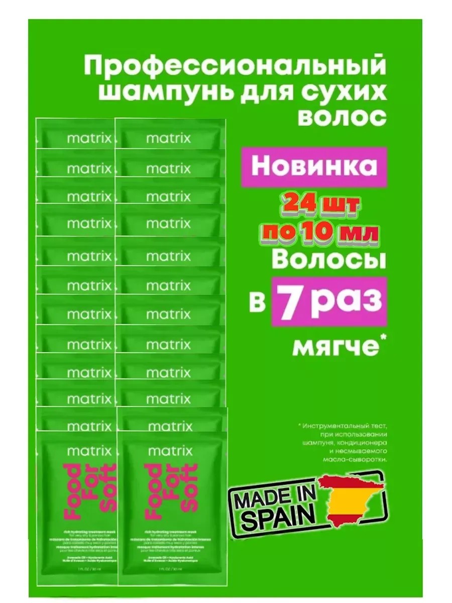 | Комплектация | Увлажняющий шампунь Food For Soft для сухих волос 10мл 24 шт; матрикс пробники; матрикс шампунь; шампунь в пробниках; лореаль шампунь; пробник; Пробники; Матрикс |
