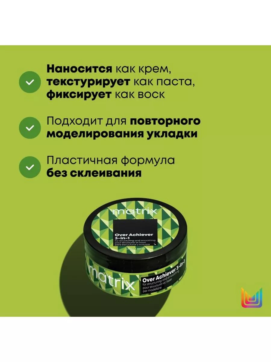 Matrix Over Achiever 3-in-1 texturizing styling product: applies like a cream, textures like a paste, and holds like a wax.
