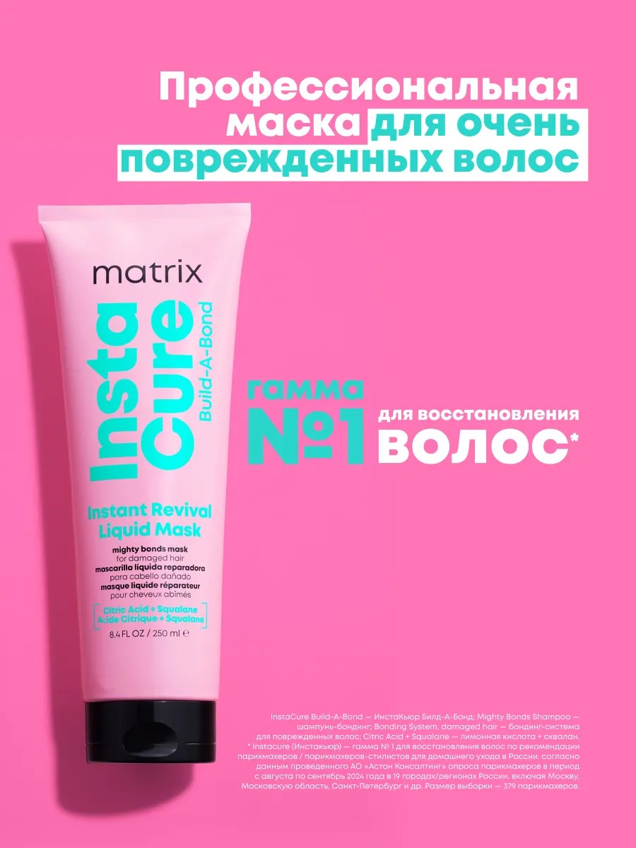 Профессиональная восстанавливающая маска Instacure Build-A-Bond (Инстакьюр Билд-А-Бонд), 250 мл – подходит для интенсивного укрепления сильно поврежденных волос изнутри и снаружи. Технология восстановления миллиарда связей внутри истонченных и ломких волос делает их в 8 раз* сильнее.