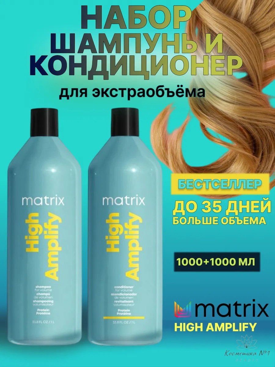 Набор для ухода за тонкими волосами – шампунь и кондиционер Total Results High Amplify (Хай Амплифай) от Matrix. Этот уникальный уход за волосами набор создан для тонких, ослабленных волос, которые нуждаются в дополнительном объеме и заботе. В набор входят: шмпунь 1000 мл., кондиционер 1000 мл. Обогащенный протеинами и без силиконов, он идеально подходит для повседневного использования. Шампунь Matrix для объема бережно очищает кожу головы и волосы, придавая им легкость и свежесть. Его формула не только удаляет загрязнения, но и помогает поддерживать здоровый баланс влаги. К этому, matrix кондиционер обеспечивает необходимое увлажнение и делает волосы более управляемыми. Этот матрикс кондиционер легко распределяется и не утяжеляет волосы, что делает их еще более воздушными и объемными. Также подходит для окрашенных волос – шампунь matrix для окрашенных и matrix для окрашенных волос кондиционер сохраняют яркость цвета, защищая его от выцветания. Этот набор шампунь и кондиционер станет вашим идеальным союзником в поддержании яркости и насыщенности цвета. Не забывайте о бальзаме матрикс, который дополнительно укрепляет структуру волос. Этот бальзам matrix обеспечивает защиту и восстановление, что делает его незаменимым элементом вашего уходового набора для волос. Набор подходит для всех типов волос и станет отличным вариантом в качестве подарка. Кондиционер для волос обогащен протеинами, что обеспечивает уход для волос профессиональный уровня. Подарите своим волосам matrix красоту для волос, которая позволит им выглядеть здоровыми и полными жизни. Выбирая набор Matrix для волос, вы делаете шаг к улучшению состояния своих прядей. Каждый продукт в этом наборе по уходу за волосами разработан с учетом потребностей тонких волос, обеспечивая объем и сияние.