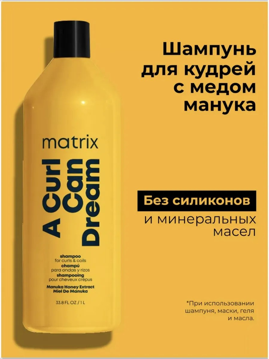 Matrix A Curl Can Dream Professional Shampoo (1000 ml) for curly and wavy hair, with Manuka honey extract, intensively cleanses, removes buildup, and moisturizes and nourishes porous curly hair.
