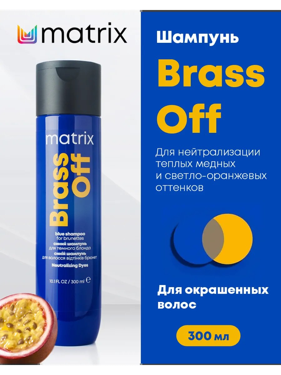 MATRIX Brass Off professional shampoo with blue-violet pigments neutralizes warm copper and light orange undertones, maintaining a cool, silvery tone. Ideal for blondes, women, and men with dark blond and bleached brunette hair. This product provides a noticeable effect from the first use against yellowness, copper, and orange tones on natural and color-treated light-colored hair. Thanks to the vitamin-enriched oil in the formula, it nourishes, conditions, softens, and adds shine. The aroma of the Brass Off anti-yellow toners features notes of nectarine, passionfruit, jasmine, rose, and vanilla. It is recommended to use the shampoo every other day after coloring to maintain a cool tone. How to use Matrix Total Results Brass Off toning shampoo: put on gloves, apply the shampoo to damp hair, leave on for 3-5 minutes, and rinse thoroughly. In case of contact with eyes, rinse immediately with water.