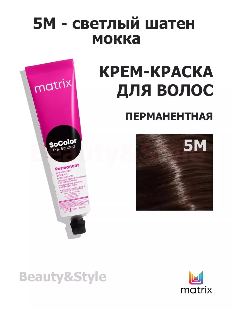 SoColor Pre-Bonded permanent cream hair color from MATRIX, shade 5M. This product belongs to a series of professional permanent cream hair colors with a unique conditioning complex, Cera Oil. The formula strengthens and increases the elasticity of the hair fiber, smoothes the cuticle, giving hair smoothness and luxurious shine. It covers up to 100% of gray hair and protects color from fading. A wide range of shades guarantees a precise match to the desired shade. This effect is achieved through the use of patented ColorGrip technology, which is based on the action of self-adjusting dyes. They interact with the hair's natural pigment, resulting in a clear and vibrant shade. The dye is sold WITHOUT developer. Developer is purchased separately. The bonder in SoColor Pre-Bonded maintains the quality of the hair color after coloring. A complex of caring ceramides helps restore porous areas of the hair, creating a smooth surface for an even color result. Wear gloves when handling. Instructions for use are provided on the product packaging.