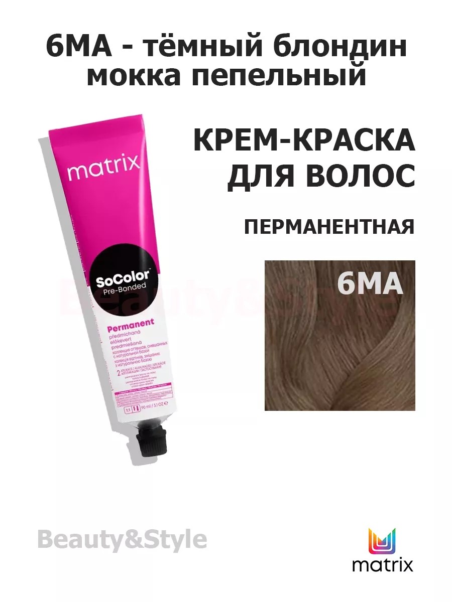 SoColor Pre-Bonded permanent cream hair color from MATRIX, shade 6MA. This product belongs to a series of professional permanent cream hair colors with a unique conditioning complex, Cera Oil. The formula strengthens and increases the elasticity of the hair fiber, smoothes the cuticle, giving hair smoothness and luxurious shine. It covers up to 100% of gray hair and protects color from fading. A wide range of shades guarantees a precise match to the desired shade. This effect is achieved through the use of patented ColorGrip technology, which is based on the action of self-adjusting dyes. They interact with the hair's natural pigment, resulting in a clear and vibrant shade. The dye is sold WITHOUT developer. Developer is purchased separately. The bonder in SoColor Pre-Bonded maintains the quality of the hair color after coloring. A complex of caring ceramides helps restore porous areas of the hair, creating a smooth surface for an even color result. Wear gloves when handling. Instructions for use are provided on the product packaging.