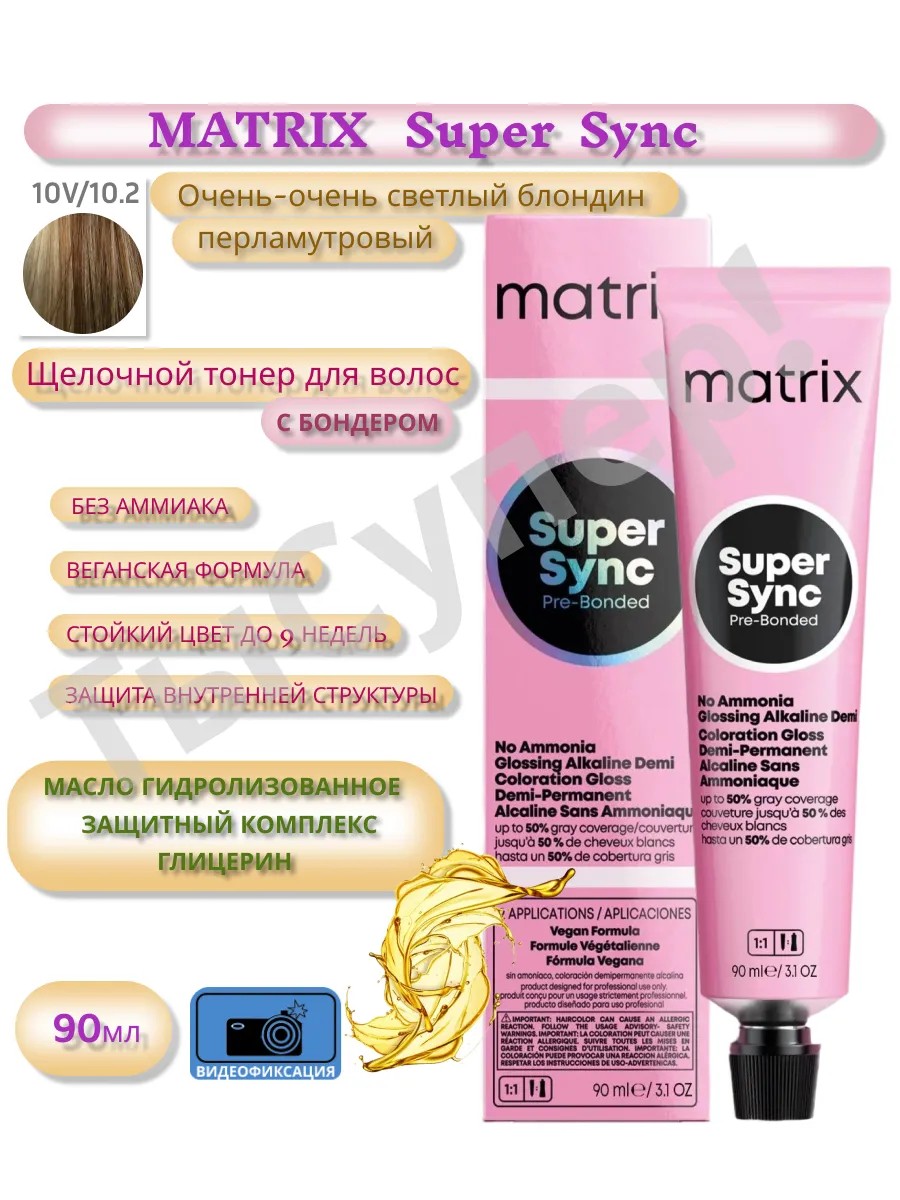 VIDEO CAPTURE OF ORDER ASSEMBLY! Matrix Super Sync: a revolution in the world of alkaline, ammonia-free coloring. Forget about dull, lifeless hair after coloring! The Super Sync system is more than just a dye; it's an entire technology that provides intense, long-lasting color for up to 9 weeks (manufacturer specifications), shine twice as strong as previous generations, and, most importantly, maximum hair health. The ammonia-free, alkaline formula makes coloring more gentle than traditional permanent dyes. A key feature of Super Sync is its ability to lift the natural hair base by up to half a tone, opening up wide possibilities for creating complex and multidimensional shades without pre-lightening. This technology effectively covers up to 50% of gray hair (manufacturer specifications), depending on the chosen shade and the initial condition of the hair, ensuring even coverage from root to tip. The innovative protective complex deserves special mention. Instead of the previous ingredients (Ionene-G and taurine), Super Sync uses citric acid and glycine. This isn't just a simple ingredient substitution; it's a thoughtful solution aimed at enhancing the protection of disulfide bonds. Citric acid, known for its antioxidant properties, combats damage caused by oxidative processes, while glycine, an amino acid, helps restore hair structure and moisturize. Additionally, the formula includes a new bonder—a special substance that anchors pigment within the hair and protects it from damage at the molecular level. The smoothing oils in Super Sync make hair silky and smooth, making combing easier. They also help retain moisture, preventing dryness and breakage. Matrix Super Sync is a high-tech product that combines rich, long-lasting color, maximum hair protection, and ease of use.
