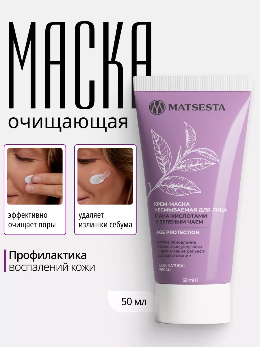 This moisturizing face mask with AHA acids and a lifting effect is a leave-in nourishing treatment against acne scars and the first signs of aging. This anti-aging, pore-tightening cream mask is suitable for all skin types and ages. It gently exfoliates dead skin cells, improves microcirculation, and combats fine lines and wrinkles. Ideal for intensive winter care, it contains green tea hydrosol with antiseptic properties and prevents the formation of comedones. Beneficial extracts and oils moisturize and tone the skin, while the rejuvenating effect of acids helps trigger natural regeneration and restore skin tone. This rejuvenating cream combats age spots, reduces wrinkles, stretch marks, and microdamage, and visibly evens out skin tone. Professional Matsesta cosmetics are paraben-free and formulated for combination, dry, and problematic skin. With regular use of this anti-aging cream mask with green tea, your skin will become smooth, nourished, and radiant. It's the perfect gift for any woman, girl, mom, friend, sister, or beloved wife, for a birthday or any occasion. The line of natural, halal cosmetics from the Russian brand Matsesta is created with your beauty in mind.