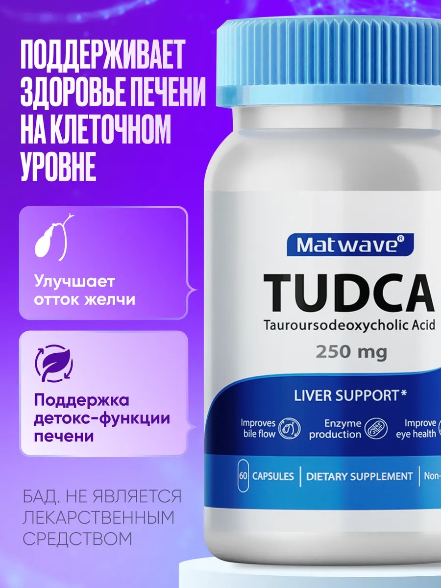 TUDCA Matwave 250 mg произведён по инновационной формуле для здоровья вашей печени. В основе БАД - Тауроурсодезоксихолевая кислота (TUDCA). Эта водорастворимая желчная кислота производится естественным образом в организме мужчин и женщин в небольших количествах. Имеет богатую историю применения в традиционной китайской медицине. Теперь вы можете получить все преимущества Тудка 250 мг в удобной форме!Принцип действия Тудка направлен на поддержание здоровья вашей печени и обеспечение ее оптимальной функциональности:Гепатопротективное действие: TUDCA предлагает комплексную поддержку печени, помогая защитить ее клетки от повреждений и поддерживая их здоровое состояние. Она способствует восстановлению и регенерации печени, а также сокращает риск образования холестериновых желчных камней, способствуя их растворению.Стимуляция выделения желчи: Tudca обеспечивает здоровый приток желчи из печени в кишечник, что способствует эффективному пищеварению и усваиванию питательных веществ. Благодаря этому, ваша печень может оптимально функционировать и поддерживать ваш организм в хорошем состоянии.Защита от токсинов: нашему организму приходится справляться с различными токсинами, как внутреннего, так и внешнего происхождения. TUDCA помогает снизить негативное влияние эндогенных (внутренних) и экзогенных (внешних) токсинов на печень. Это особенно важно в условиях современной загрязненной среды.Мультифункциональность для вашего здоровья: помимо своего гепатопротективного действия, TUDCA также обладает холеретическим эффектом, поддерживая вашу желчную систему в рабочем состоянии. Тудка оказывает эффект как витамины, которые способствуют укреплению общего состояния здоровья печени, глаз (сетчатки) и чувствительности к инсулину (способствует здоровой реакции клеток на инсулин в мышцах и тканях печени). А также оказывает иммуномодулирующий эффект. Может применяться как витаминный комплекс, поддерживая ваш иммунитет на высоком уровне.Представьте себе, как ваша печень будет благодарна за все эти преимущества! Используйте TUDCA и мультивитамины для поддержания здоровья печени и общего иммунитета. Помогите своему организму сегодня и в будущем он отблагодарит Вас крепким здоровьем!БАД, не является лекарством.Состав: Tauroursodeoxycholic Acid 250 мг. Капсула: желатин, рисовая мука.Условия отпуска: без рецепта.Срок годности и условия хранения: 2 года, хранить в сухом, защищенном от света месте, при температуре не выше 25°С.Форма выпуска и фасовка: 60 капсул по 250 мг.Способ применения: принимать по 1-2 капсулы в день перед едой. Не рекомендуется применять в один день с алкоголем. Допустимо возобновить приём Тудка на следующий день после употребления алкоголя.Продолжительность приема - 1 месяц. Производитель: NDCG LLC, США. Годен до 03.2027.г.