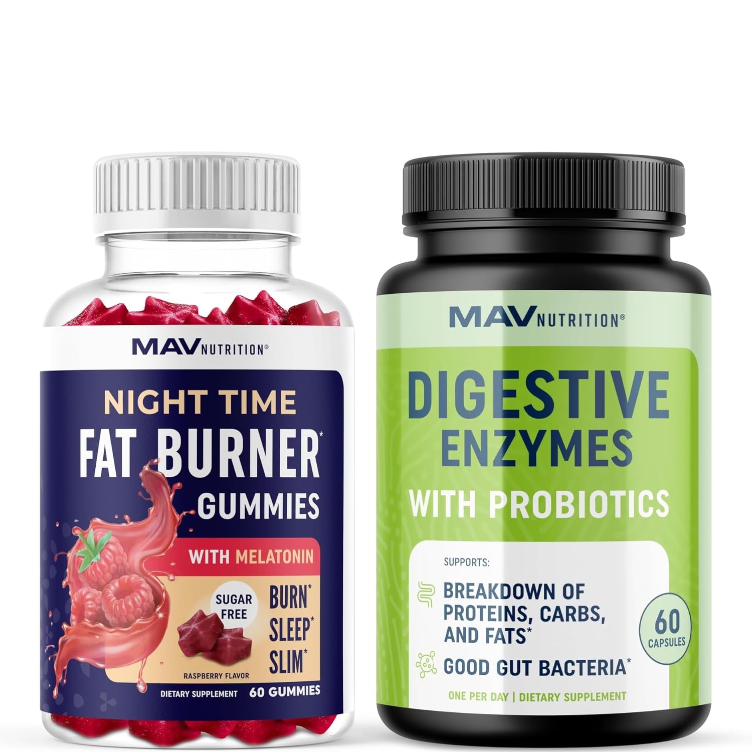 Mav Nutrition: It's our mission to help people attain the highest degree of health and performance using a holistic approach to nutrition and fueling - These statements have not been evaluated by the Food and Drug Administration . Made to Work with Every Diet: These super enzymes break down proteins, fats, and carbs, and are Vegetarian, Gluten-Free, Non-GMO, and Third-Party Tested. Sleep Weight Loss Support: Quality sleep is key to effective fat burning and our gummies contain thermogenic ingredients plus 4mg of Melatonin to help you fall asleep easily . Nighttime Fat Burner: MAV Nutrition's Night Time Fat Burner gummies support a healthy metabolism and enhance fat burning while you sleep, all in a tasty form . With 3 Strains of Lactobacillus: Formulated with three potent Lactobacillus strains, our Digestive Enzymes support optimal digestion and a balanced gut biome .