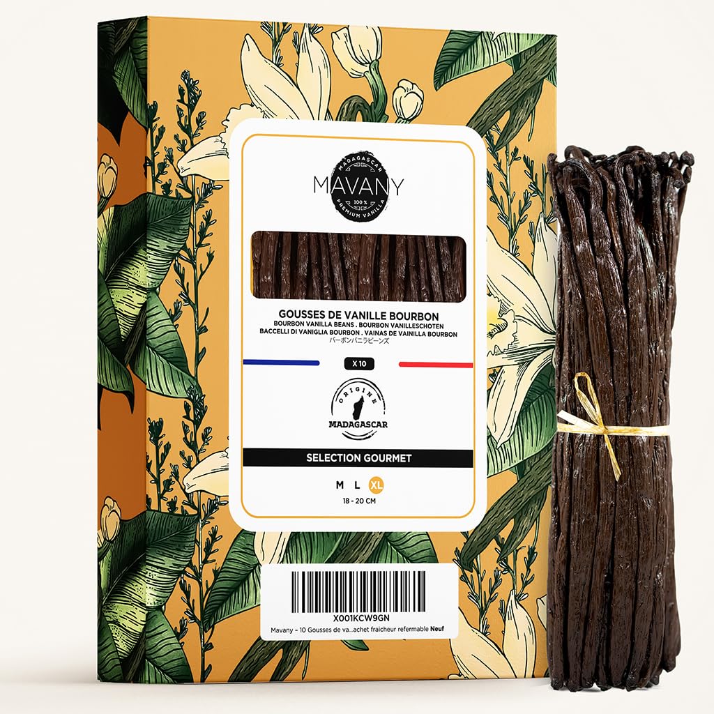 Traditionally and artisanally prepared - our vanilla pods are hand-harvested in the Mananara region of Madagascar. These vanilla pods have been refined using traditional methods, for an ideal moisture content for baking. Our "MATOY" selection is distinguished by its aromatic notes of cocoa, caramel, flower, and complex vanilla. No middlemen - We work with peasant producers who cultivate undergrowth crops, without pesticides. The preparation is done on our premises, respecting hygiene rules. Our gourmet range is fragrant, fresh, fatty, and fleshy - Our whole pods are easy to split - Ideas for use: desserts, ice cream, pastry cream, entremets, cannelés, vanilla yogurt, etc. Black brown vanilla selected for baking, ice cream, and savory dishes - Exceptional spices - MAVANY Bourbon vanilla from Madagascar is prized by cooking and baking enthusiasts. A large 18-20 cm gourmet vanilla pod from our MATOY selection weighs between 5 and 7g. A grand cru, this exceptional quality represents only 5 of annual vanilla production.Préparation de manière traditionnelle et artisanale - nos gousses de vanille sont récoltées à la main dans la région de Mananara à Madagascar. Ces gousses de vanille ont été affinées suivant un savoir-faire traditionnel, pour une teneur en humidité idéale pour la pâtisserie. Notre sélection "MATOY" se distingue par ses notes aromatiques cacaotées, caramélisées, fleuries, vanillées complexe. Sans intermédiaire - Nous travaillons avec les paysans producteurs qui pratiquent des cultures sous-bois, sans pesticide. La préparation est faite dans nos locaux, respectant les règles d'hygiènes. Notre gamme gourmet est parfumée, fraiche, grasse, charnue - Nos gousses entières sont faciles à fendre - Idées d'utilisation: desserts, glace, crème pâtissière, entremet, cannelés, yaourt vanille …. Vanille noire brun sélectionnée pour la pâtisserie, les glaces et plats salés - Épices d'exception - La vanille Bourbon MAVANY de Madagascar est prisée des passionnés de cuisine et de pâtisserie. Une grande gousse de vanille gourmet de notre sélection MATOY 18-20 cm pèse entre 5 et 7g. Grand cru, cette qualité d'exception représente uniquement 5 de la production annuelle de vanille.