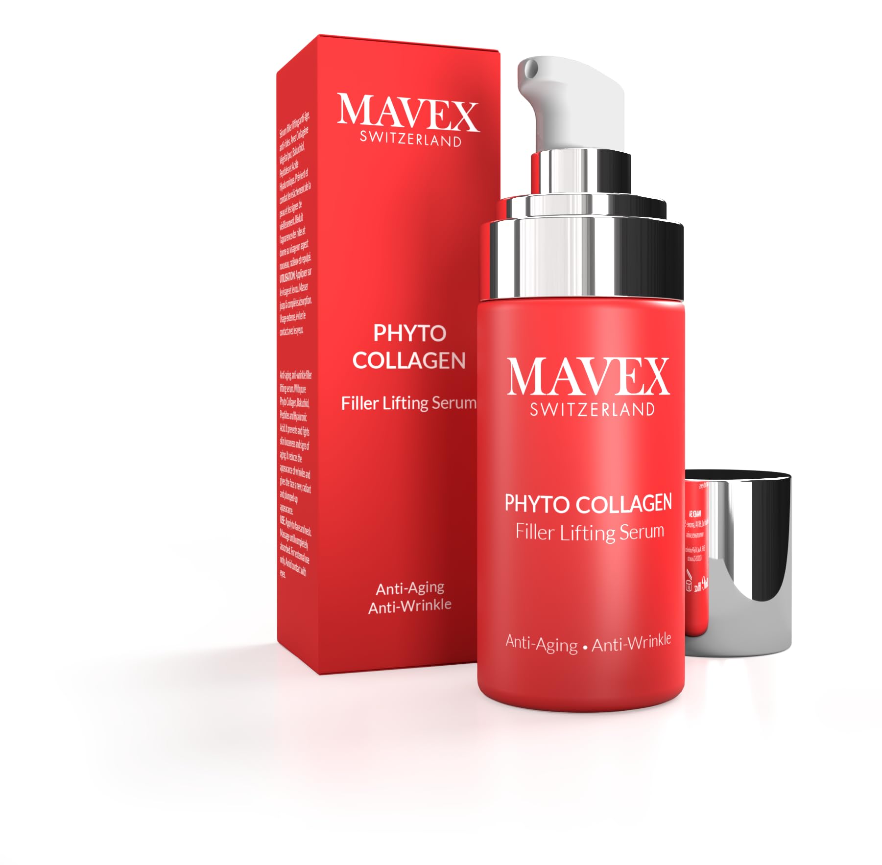 Mavex Face Serum for Skin Rejuvenation Discover the revolutionary anti-aging and anti-wrinkle lifting serum: Mavex FILLER Lifting Serum. This serum is based on advanced science and plant complexes to combat sagging skin and fight the signs of aging. It effectively reduces the appearance of wrinkles, giving your face a radiant and plump new look. The light and silky texture of this serum allows for visible skin firming and volume reshaping. Thanks to the unique multi-layered technology of the included pearl, the serum captures light and gives your skin a smooth and radiant appearance. Application is easy, and the serum absorbs quickly without leaving a sticky feeling. Discover the transformative effect of Mavex FILLER Lifting Serum and give your skin the care it deserves. Give your face the firming and plumping attention it needs to look youthful and revitalized. DIRECTIONS Apply to face and neck and massage until fully absorbed. For outdoor use, avoid contact with eyes. SAFETY WARNING For outdoor use, avoid contact with eyes. See moreMulti-layer technology: Contains special pearls with multi-layer technology that capture light and give the skin a uniform and luminous appearance. Lightweight and silky texture: Thanks to its lightweight and silky texture, the serum is easy to apply, absorbs quickly, and leaves no sticky residue on the skin. Anti-aging and wrinkle reduction: The serum prevents sagging skin, combats signs of aging, and reduces the appearance of wrinkles, leaving skin fresh, radiant, and plump. High percentage of natural ingredients: Composed of 97 natural ingredients, the serum uses advanced phytocomplexes to effectively nourish and revitalize the skin.MAVEX PHYTO COLLAGEN Sérum pour le visage Filler Lifting 30 ml Anti-âge Anti-ridesDESCRIPTION DU PRODUIT DESCRIPTION DU PRODUIT Sérum visage Mavex pour le rajeunissement de la peau Découvrez le sérum liftant anti-âge et anti-rides révolutionnaire : le sérum liftant FILLER Mavex. Ce sérum est basé sur une science avancée et des complexes végétaux pour lutter contre le relâchement de la peau et lutter contre les signes du vieillissement. Il réduit efficacement l'apparence des rides, donne à votre visage un nouveau look éclatant et repulpé. La texture légère et soyeuse de ce sérum permet un raffermissement visible de la peau et une redéfinition du volume. Grâce à la technologie multicouche unique de la perle incluse, le sérum capte la lumière et donne à votre peau un aspect uniforme et rayonnant. L'application est facile et le sérum pénètre rapidement sans laisser de sensation collante. Découvrez l'effet transformateur du sérum liftant FILLER Mavex et offrez à votre peau le soin qu'elle mérite. Donnez à votre visage l'attention raffermissante et repulpante dont il a besoin pour avoir l'air jeune et revitalisant. MODE D'EMPLOI Appliquer sur le visage et le cou et masser jusqu'à absorption complète. Pour une utilisation en extérieur, éviter tout contact avec les yeux. AVERTISSEMENT DE SÉCURITÉ Pour une utilisation en extérieur, évitez tout contact avec les yeux. Voir plusTechnologie multicouche : contient des perles spéciales avec la technologie multicouche qui captent la lumière et donnent à la peau un aspect uniforme et lumineux. Texture légère et soyeuse : grâce à sa texture légère et soyeuse, le sérum est facile à appliquer, pénètre rapidement et ne laisse pas de sensation collante sur la peau. Anti-âge et réduction des rides : le sérum prévient le relâchement de la peau, combat les signes du vieillissement et réduit l'apparence des rides, laissant la peau fraîche, éclatante et repulpée. Haut pourcentage d'ingrédients naturels : composé à 97 d'ingrédients naturels, le sérum utilise des phytocomplexes avancés pour nourrir et revitaliser efficacement la peau.