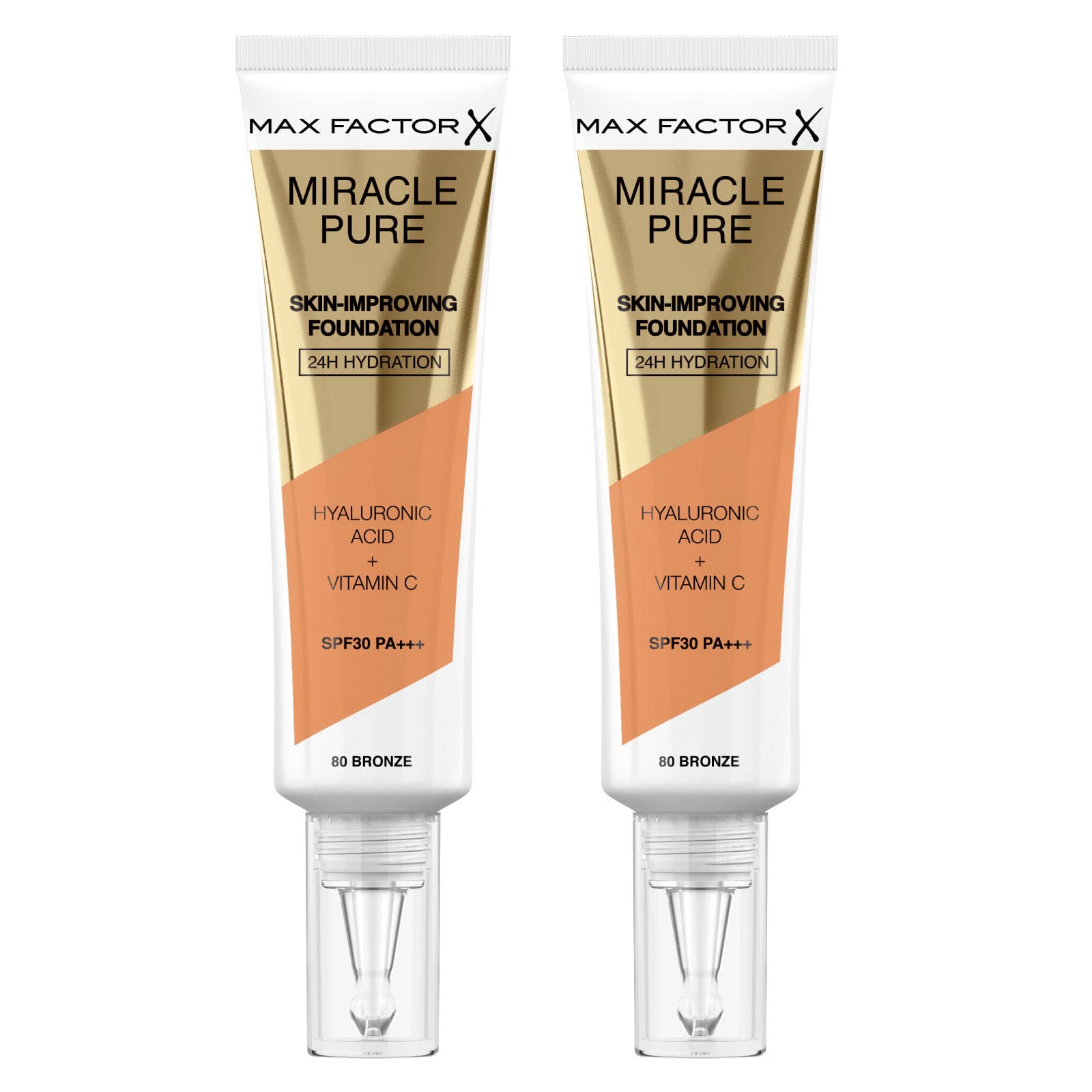 Max Factor Miracle Pure Perfecting Foundation, with 89 Skin-Care Ingredients, Hyaluronic Acid, Vitamin C, Collagen Boosting Complex, SPF 30 PA . Clinically tested foundation to care for your skin while you wear it, giving it greater radiance, firmness, and elasticity. In just one minute, with a single drop of product, it evens out skin tone and makes it radiant. Skin stays hydrated for 24 hours. Buildable coverage. HOW TO USE Apply a small amount of foundation to the center of your face and blend outwards with a foundation brush or your fingertips.Formula: Infused with 91 skincare ingredients, including vitamin C and hyaluronic acid, it provides 24-hour hydration. Effects and Benefits: In just one minute, with a single drop of product, your skin is evenly blended and cared for, giving it greater radiance, firmness, and elasticity. Application: Apply a small amount of foundation to the center of your face and blend outwards with a foundation brush or your fingertips. Miracle Pure: Clinically tested, hydrating liquid foundation that cares for your skin while you wear it. The kit contains: 2 x 30ml Max Factor Miracle Pure 80 Bronze foundations.2 x Max Factor Miracle Pure Fondoteint Liquide Hydratant avec Vitamine C et SPF 30 Nuance 80 Bronze - 2 fond de teint de 30 mlDESCRIPTION DU PRODUIT DESCRIPTION DU PRODUIT Max Factor Miracle Pure Fond de teint Perfectionnant, avec 89 de Ingrédients Skin-Care, Acide hyaluronique, Vitamine C, Collagène boosting complex, SPF 30 PA . Fond de teint cliniquement testé pour prendre soin de la peau pendant que vous le portez, en lui donnant une plus grande luminosité, compacité et élasticité. En une seule minute et avec une seule goutte de produit uniforme le carné et le rend radieux. La peau reste hydratée pendant 24 heures. Couverture modulable MODE D'EMPLOI Appliquer une petite quantité de fond de teint au centre du visage et estomper vers l'extérieur avec un pinceau de fond de teint ou le bout des doigtsFormule : infuse avec 91 d'ingrédients pour le soin de la peau parmi lesquels la vitamine C et l'acide hyaluronique fournit une hydratation pendant 24 heures. Effets et avantages : en une seule minute et avec une seule goutte de produit uniforme l'incarné et prend soin de votre peau en lui donnant une plus grande luminosité, de comptage et d'élasticité. Application : appliquer une petite quantité de fond de teint au centre du visage et d'ombrager vers l'extérieur avec un pinceau à fond de teint ou à l'embout des doigts. Miracle Pure : fond de teint liquide hydratant cliniquement testé pour prendre soin de la peau pendant que vous le portez. Le kit contient : 2 fonds de couleur Max Factor Miracle Pure 80 Bronze de 30 ml.