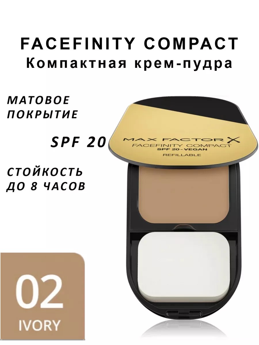 Обновленная версия пудры FACEFINITY - полностью веганский состав, футляр стал многоразового использования. Компактная крем-пудра Facefinity Compact от МаксФактор с зеркалом и спонжем – это идеальное средство для тех, кто хочет добиться естественного макияжа. Тон идеально подстраивается под оттенок Вашей кожи. Благодаря кремовой текстуре пудра легко наносится, равномерно распределяясь по коже и придавая ей здоровый вид. Пудра обладает стойким и естественным покрытием, которое оценят женщины, постоянно находящиеся в движении. Нежный матовый финиш помогает скрывать мелкие несовершенства, выравнивает тон лица и обеспечивает матовость, избавляя от блеска. FaceFinity эффективно скрывает недостатки кожи — разглаживает текстуру, устраняет красноту, прыщики, расширенные поры и пигментацию. Элегантный футляр глянцевого золотистого цвета станет удачным аксессуаром и поместится в любой сумочке - для безупречного макияжа каждый день. Пудра имеет солнцезащитный СПФ-фильтр, который спасает кожу от вредного воздействия солнца – это идеальный вариант на лето. Летний макияж с этой крем-пудрой сохранится на протяжении всего дня благодаря стойкому формату средства.