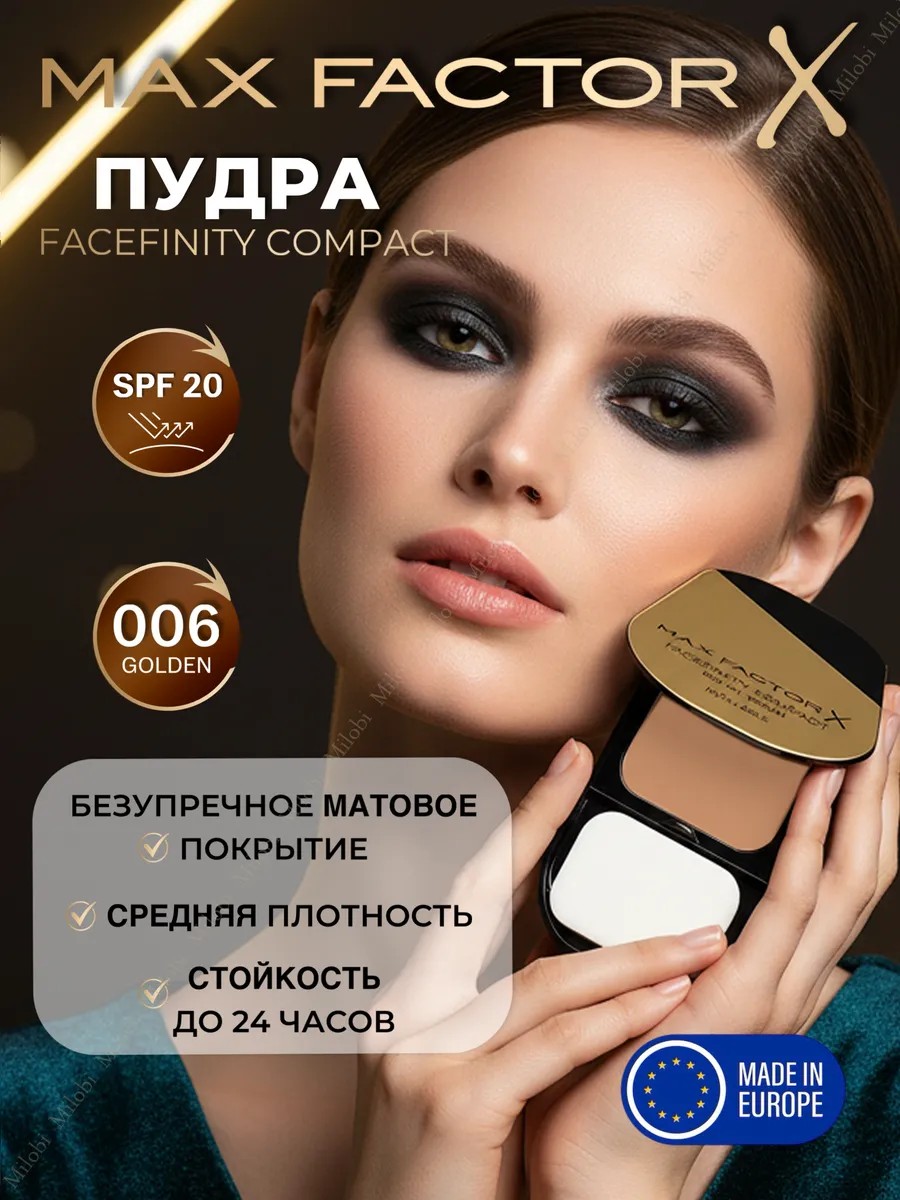 Компактная пудра для лица Facefinity Compact от Max Factor с зеркалом и со спонжем – это идеальное средство для тех, кто хочет добиться естественного макияжа. Макс Фактор тон 006 Golden (золотой) - темный, но не желтый, имеет насыщенный шоколадный оттенок, который идеально подойдет смуглой коже. У пудры кремовая и плотная текстура, которая легко наносится, равномерно распределяясь по коже, придавая ей здоровый вид. Этот уникальный продукт женской косметики для макияжа сочетает в себе лучшие качества тонального крема и пудры. Он обеспечивает матовый финиш, который помогает скрывать мелкие несовершенства, выравнивает тон лица и избавляет от жирного блеска. Подстраивается под тон кожи, скрывает веснушки и следы от прыщей и акне, сглаживает поры и матирует. Для более плотного матового покрытия пудру нужно наносить спонжем, для более естественного и легкого - кистью как рассыпчатую пудру. Тон идеально подстраивается под оттенок вашей кожи благодаря широкому спектру цветов: от бежевого до розового подтона. Темные, золотистые оттенки можно использовать как бронзер или для контуринга Оттенки с розовым подтоном используйте в качестве румян. Пудра максфактор с спф, она имеет солнцезащитный spf фильтр 20, который спасает кожу от вредного воздействия солнца – это идеальный вариант на лето. Летний макияж с этой крем-пудрой сохранится на протяжении всего дня благодаря стойкому формату средства.
