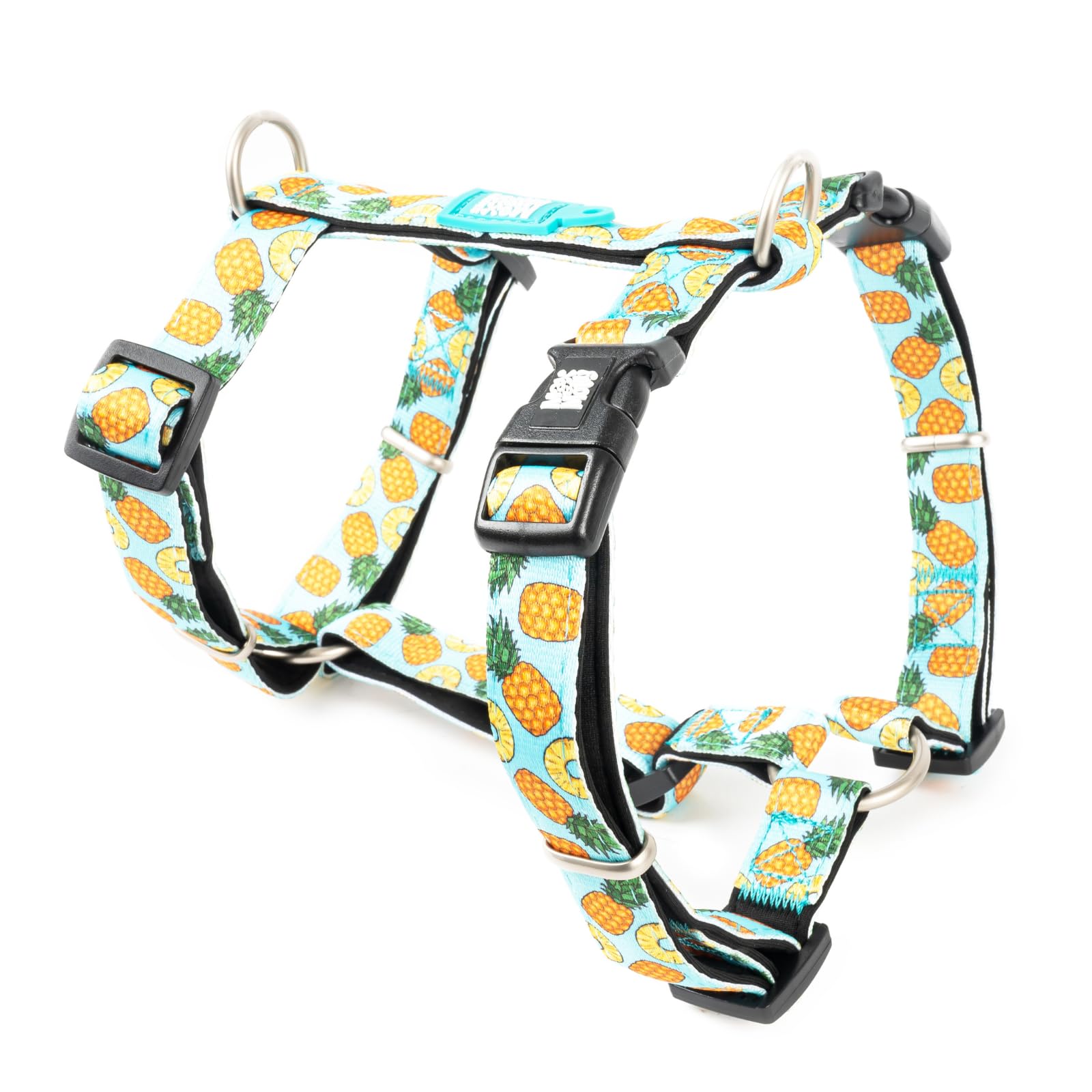 ""Our Max Molly H-Care are the perfect daily companion for your four-legged friend and you. With our creative designs, you make every sidewalk a catwalk and are certainly the eye-catcher of the quarter. But our harnesses are not only stylish, but also safe and safePractical.Leash or to attach them to B. Accessories.And your dog is not particularly pleasant."" Instructions Going for a walk, jogging or driving for bicycles with your dog.Sauber: So that the dishes can look like new after a trip even after a trip in bad weather, it is machine washable at 30 C.Flexible: The dishes are suitable for most dog breeds, since it can be individually adjusted by the shape and four controllers for the perfect size setting.Practical comfortable: it does not rub on the foresights and thus grants maximum freedom of movement for your darling.Sure: the 2 power goats, our megast-strong click closures, keep the dog gather 5 times.With the extra D ring at the front of the neck, the dog can be better guided if necessary.High quality: The light dishes are made of soft, hypoallergenic and quickly drying neoprene with an extra padding for a pleasant grip and extremely tear -resistant polyester with precise and cool print.The metal parts are made of solid, solid, brushed material.""Unsere Max Molly H-Geschirre sind der perfekte tägliche Begleiter für deinen Vierbeiner und dich. Mit unseren kreativen Designs macht ihr jeden Bürgersteig zum Laufsteg und seid mit Sicherheit der Hingucker des Viertels. Unsere Geschirre sind aber nicht nur stylish, sondern auch sicher und praktisch. Die zwei superstarken Klickverschlüsse halten das 5-fache des Hundegewichts, durch die Regler ist das Geschirr stufenlos verstellbar und lässt sich so an fast jeden Hundekörper anpassen. Auf dem Rücken sind gleich zwei D-Ringe für mehr Flexibilität und Kontrolle beim Führen an der Leine oder einfach um noch z. B. Accessoires anzuhängen. Unsere H-Geschirre bestehen aus einer robusten Polyester-Seite, bedruckt mit einzigartigen Designs und dem weichen, schnell trocknendem, anschmiegsamen Neopren auf der Rückseite. Durch die Materialauswahl sind die H-Geschirre ultraleicht und für deinen Hund besonders angenehm zu tragen. Deine Fellnase wird gar nicht merken, dass sie ein Geschirr trägt. Mit diesem Geschirr könnt ihr ganz unbeschwert in euer nächstes Abenteuer starten. "" GEBRAUCHSANWEISUNG Zum Spazieren gehen, joggen oder aber auch zum Fahrrad fahren mit ihrem Hund geeignet.SAUBER: Damit das Geschirr auch nach einem Ausflug bei schlechtem Wetter wieder wie neu aussehen kann, ist es bei 30 C maschinenwaschbar. FLEXIBEL: Das Geschirr ist für die meisten Hunderassen geeignet, da es durch die Form und vier Regler für die perfekte Größeneinstellung individuell eingestellt werden kann. PRAKTISCH BEQUEM: Es scheuert nicht an den Vorderläufen und gewährt somit maximale Bewegungsfreiheit für deinen Liebling. SICHER: Die 2 Power Buckel, unsere megastarken Klick-Verschlüsse, halten das 5-fache des Hundegewichts. Durch den extra D-Ring vorne am Nacken lässt sich der Hund bei Bedarf besser führen. HOCHWERTIG: Das leichte Geschirr besteht aus weichem, hypoallergenem sowie schnell trocknendem Neopren mit einer extra Polsterung für einen angenehmen Griff und extrem reißfestem Polyester mit präzisem und coolem Aufdruck. Die Metallteile bestehen aus massivem, soliden, gebürsteten Material.Max Molly H-Geschirr - Sweet Pineapple XS XS Sweet Pineapple