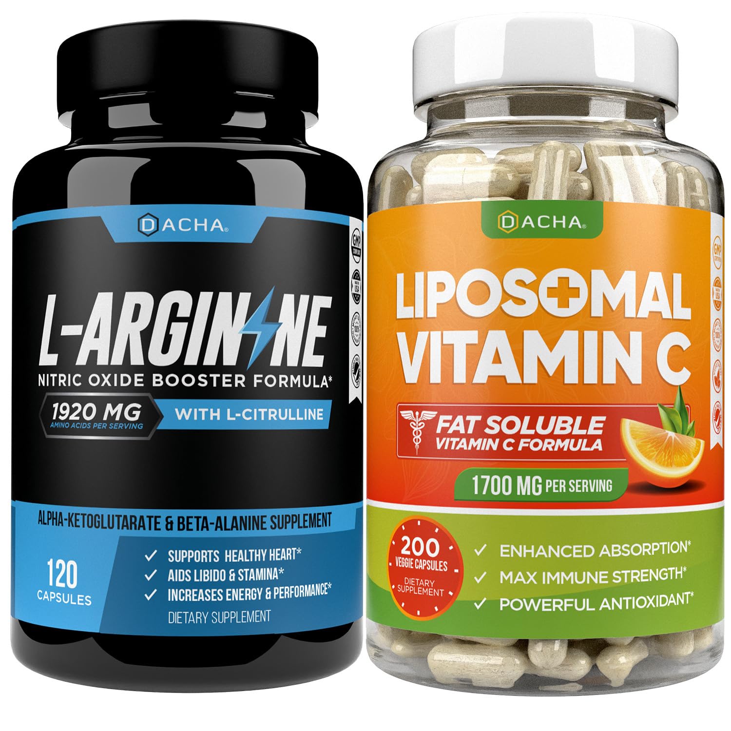 NATURE-MADE BLEND – You want to keep your muscles and immune system strong? This is why we suggest our combination of L-Arginine and Liposomal Vitamin C. Our blends per supplement are 100 all-natural, with no additives, made in the USA, and with all ingredients listed to help you decide whether it's good for your body. FUEL YOUR ENGINE - Get your body firing on all cylinders with Dacha L-Arginine and Liposomal Vitamin C. Increased blood flow throughout the body allows oxygen to go where it needs to be, to get your performance to where it needs to be. Combining these two natural supplements helps improve training, allowing you to work out at a higher capacity for a longer period of time, plus boosted with its high absorption and potency combo. FEELING GOOD SHOULD BE NATURAL – Dacha L-Arginine is an essential basic amino acid that is one of the body's important building blocks. It is the precursor of nitric oxide that is an essential regulator of many body processes such as the immune system and supports normal blood pressure. Adding Dacha Liposomal Vitamin C to the mix supports the body's immune health 2X further!.
