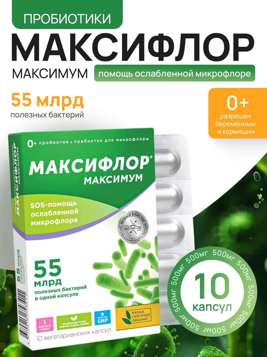 Максифлор Максимум сочетает в себе пробиотические бактерии и пребиотик, что способствует выживанию полезных микроорганизмов и усилению их благотворного воздействия на работу ЖКТ.