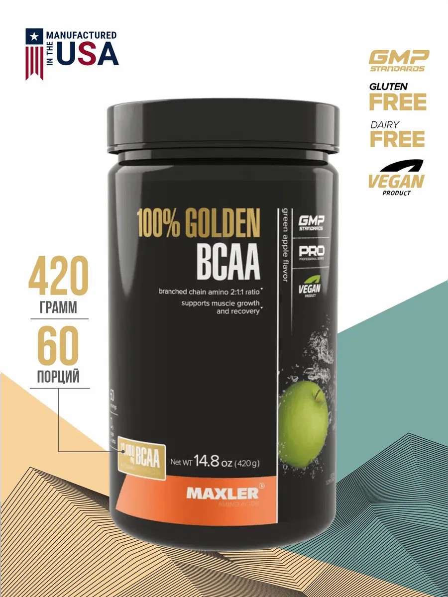Maxler Аминокислоты 100% Golden BCAA порошок зелёное яблоко, 420 грамм обеспечивает рост и укрепление мышц, повышает физическую работоспособность и уменьшает период восстановления после активной силовой нагрузки. Добавка стимулирует процесс сжигания жира, обеспечивая подтянутость и красивый рельеф тела.
